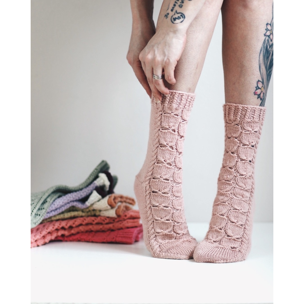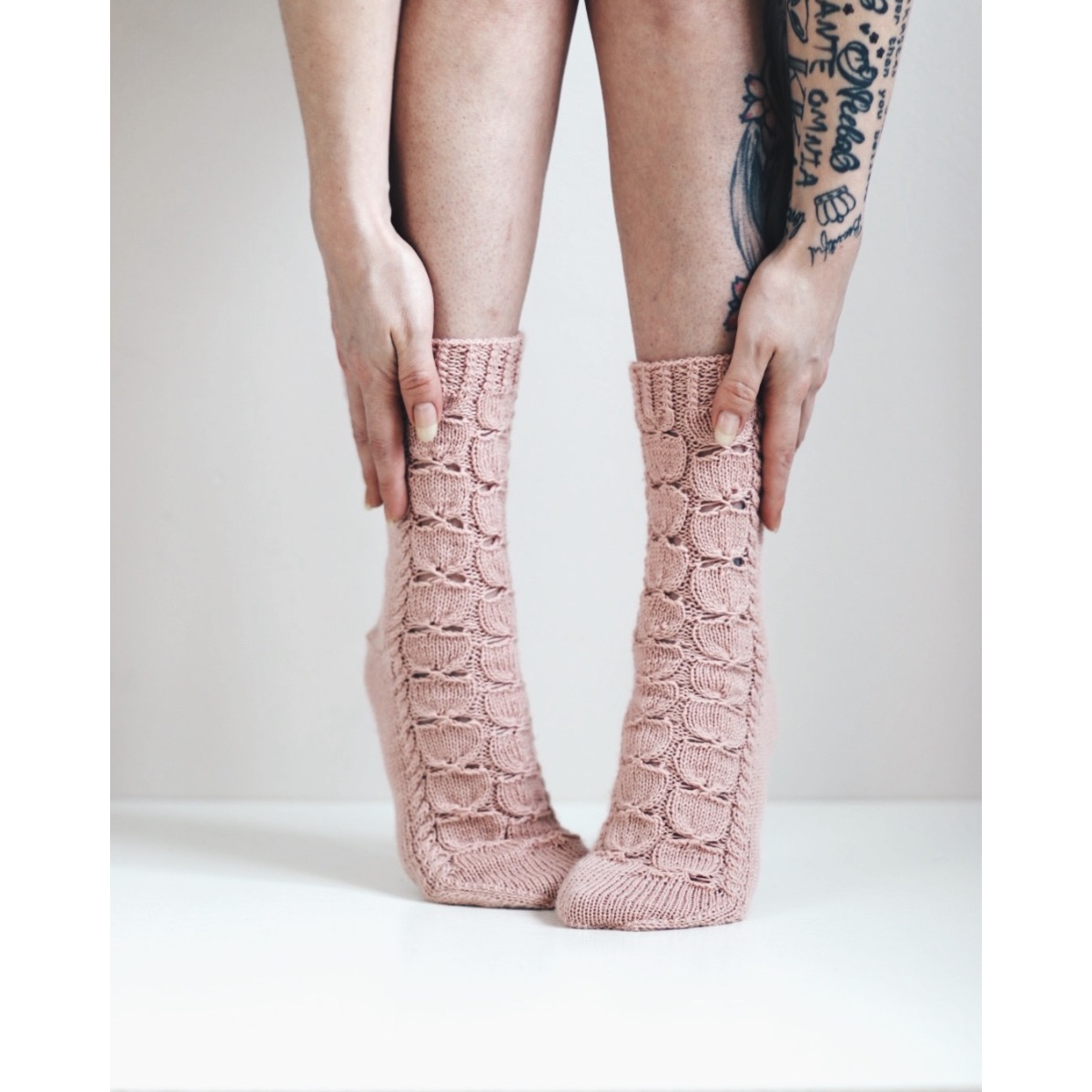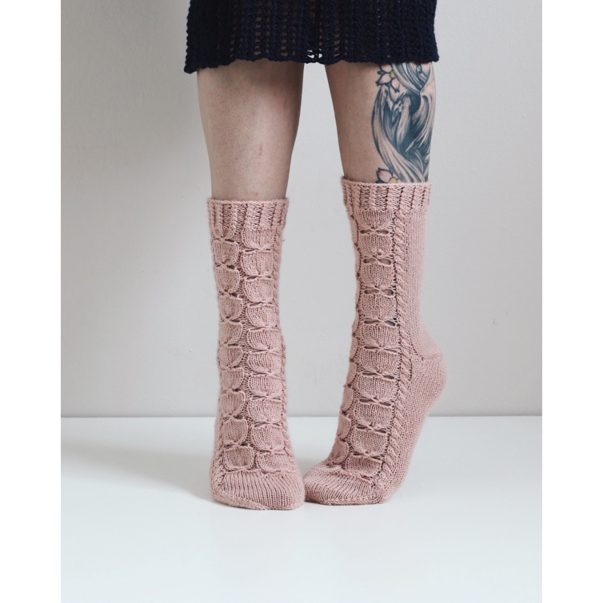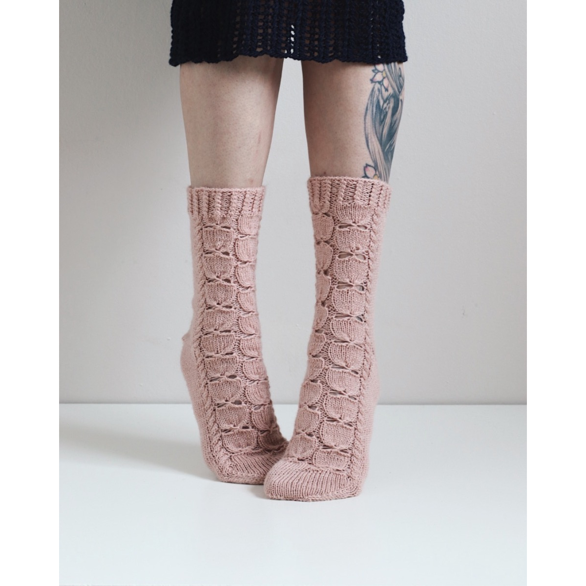 Ruusunen-sukat neulotaan varresta varpaisiin. Kuviota seuraamalla luot ruusunterälehtiä sukan eteen.