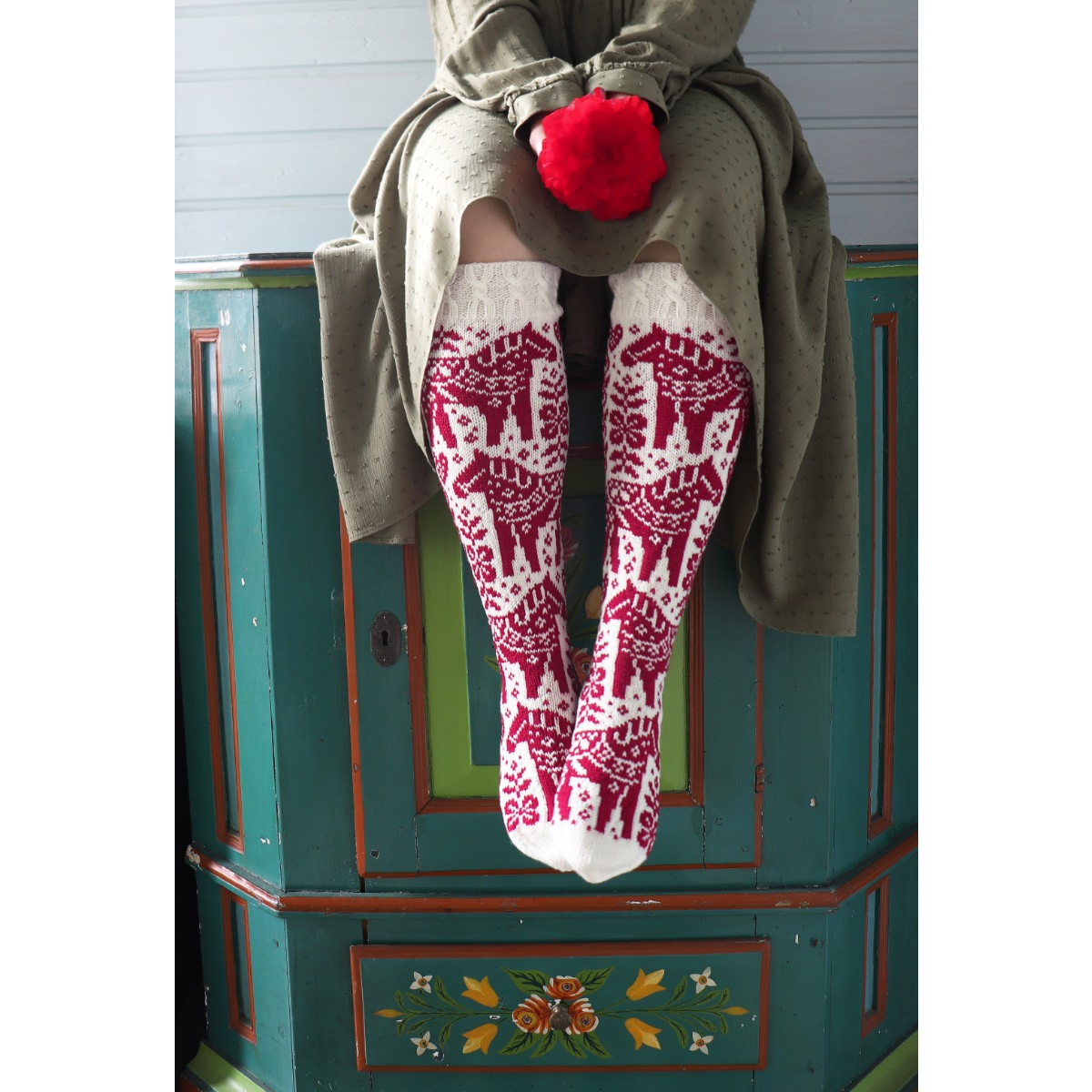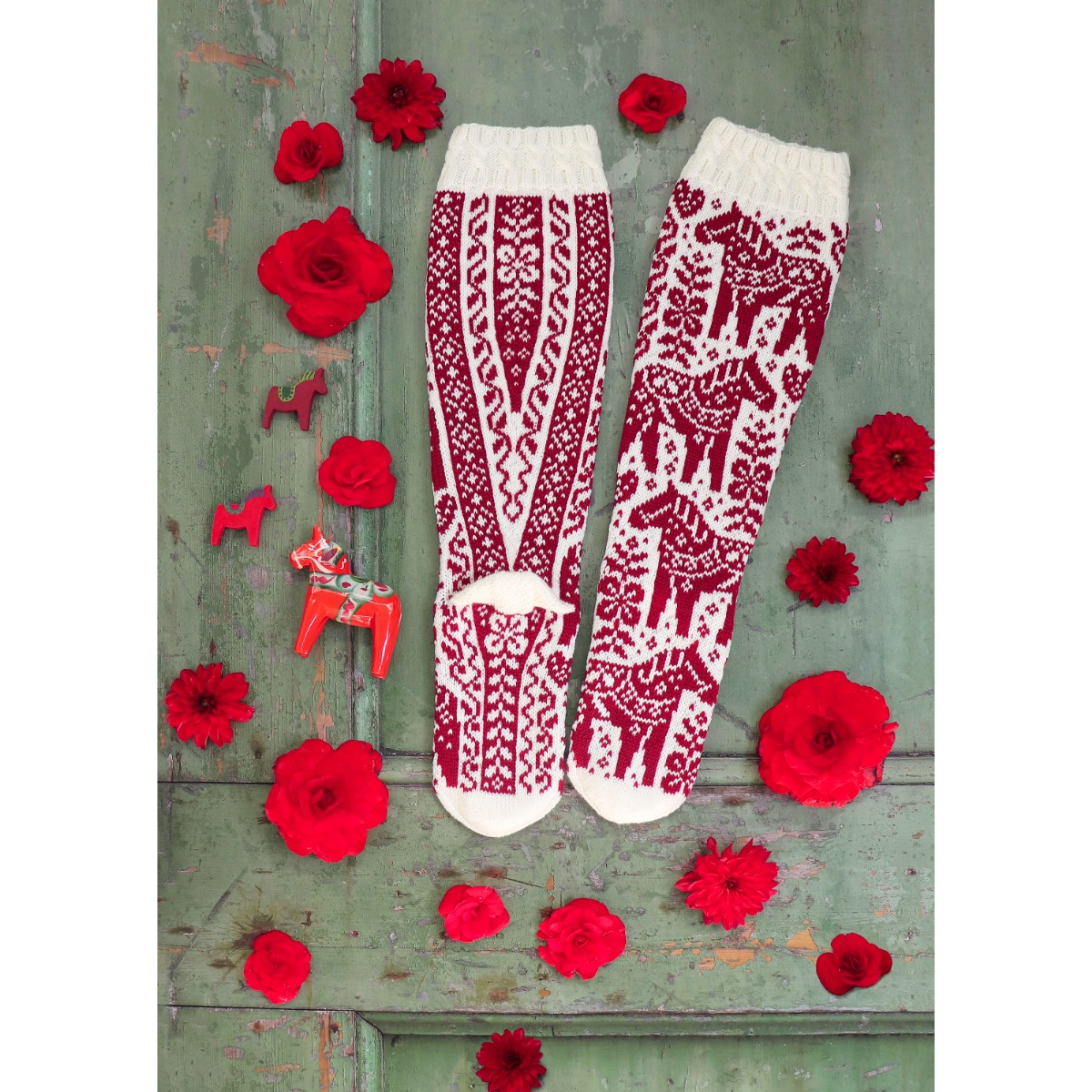 Elli Ilona -sukat neulotaan kuvan mukaisissa väreissä, ja voit valita kahdesta eri pohkeen leveydestä ja jalkaterän koosta.