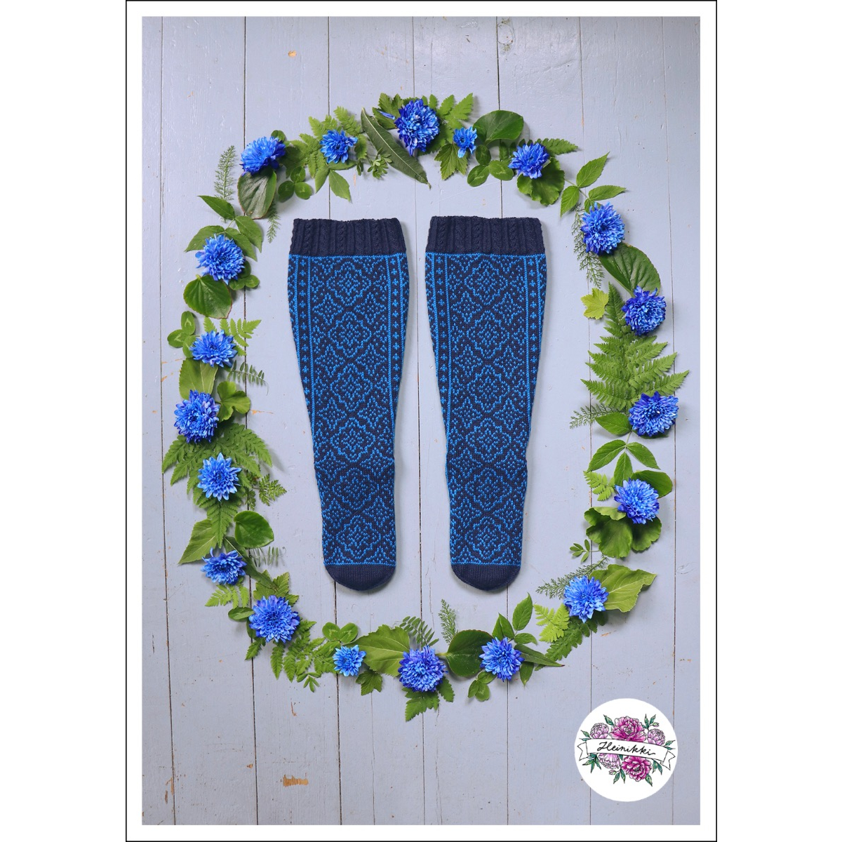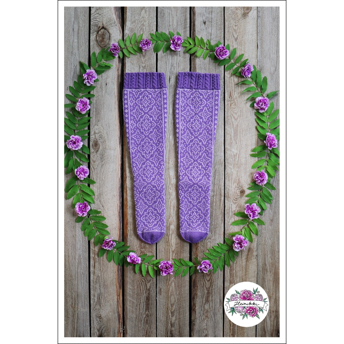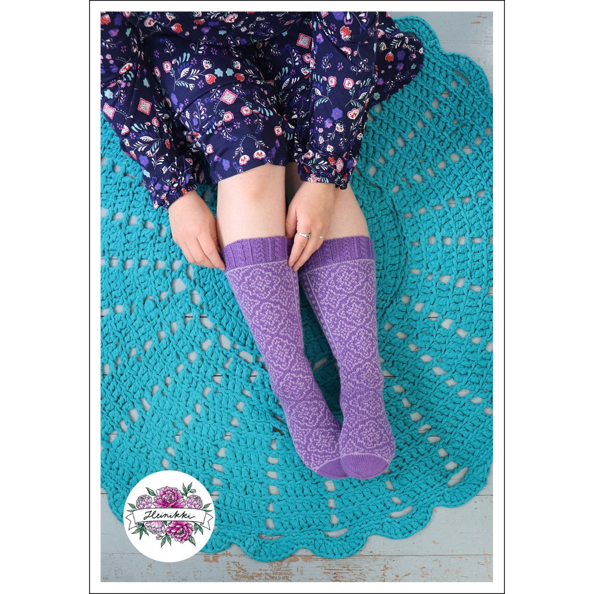 Lyydia-sukkien 16-sivuinen PDF-ohjelehtinen sisältää hyvät kaaviokuvat ja sanalliset ohjeet kauniisiin kirjoneulesukkiin kahdessa eri koossa: