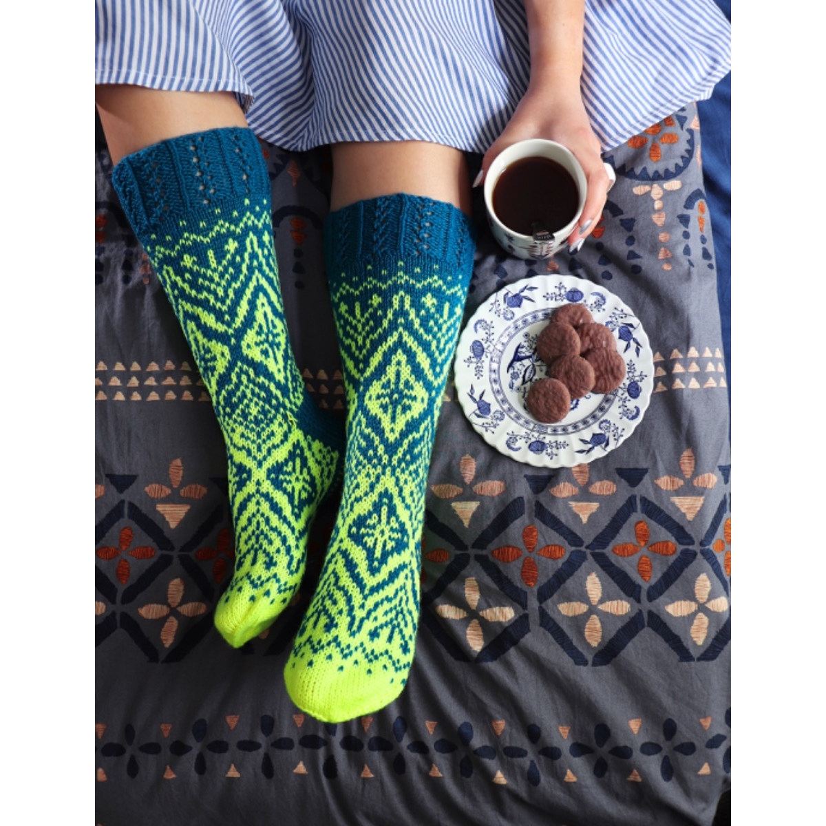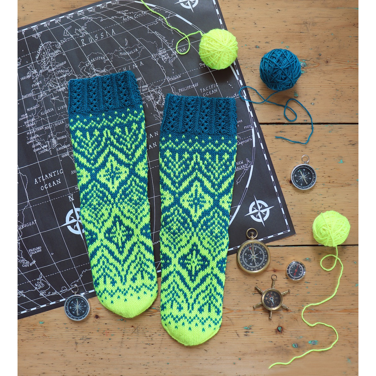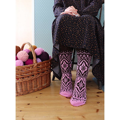 Unelmakartta-sukkien 8-sivuinen PDF-ohjelehtinen sisältää hyvät kaaviokuvat ja sanalliset ohjeet koristeellisiin kirjoneulesukkiin: