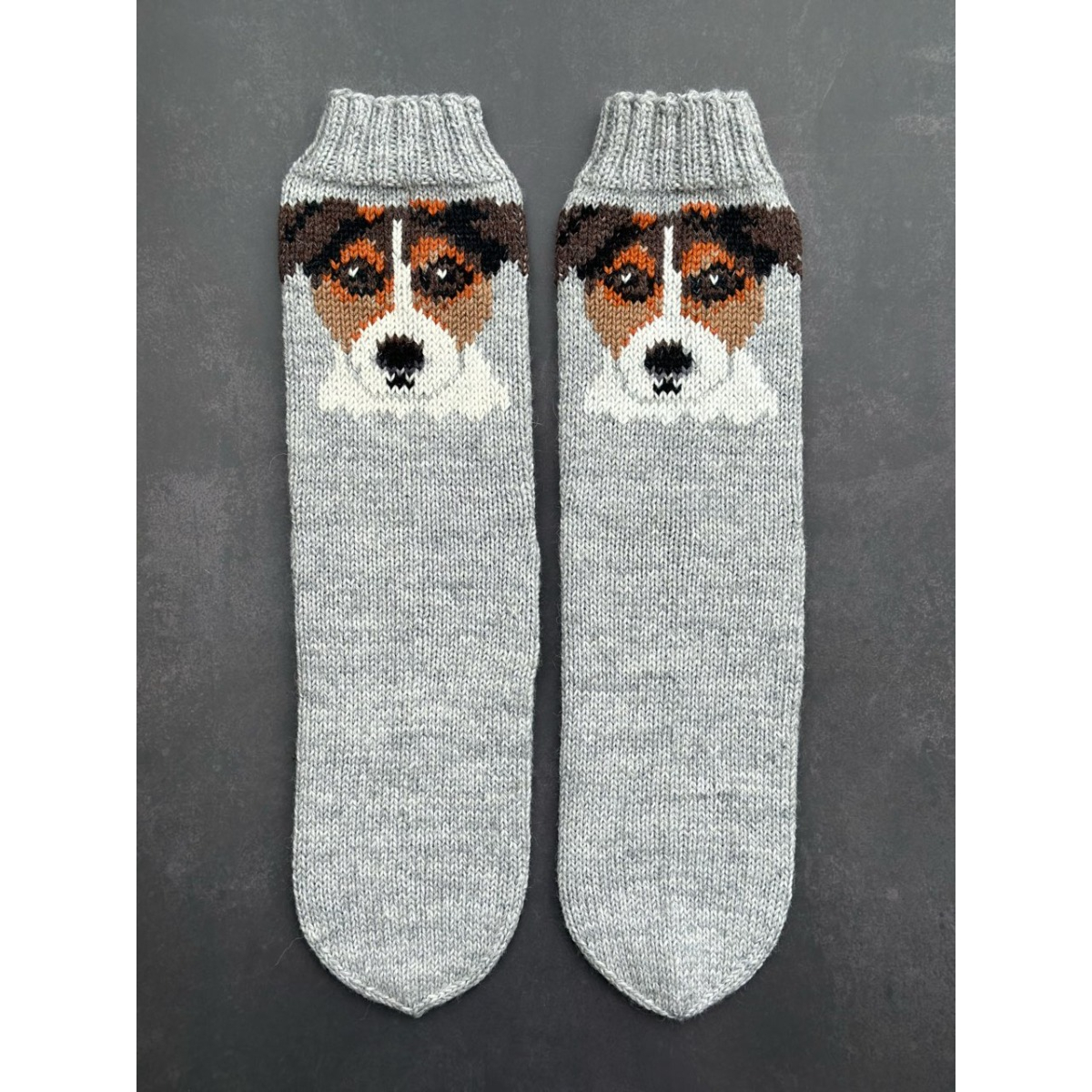 Sukat tehdään konepestävästä keskipaksusta sukkalangasta, ja pohjavärinä on keskiharmaa mistä koiran kuva erottuu hyvin ja pääsee oikeuksiinsa. Varren pituus kantapään alta on joka koossa noin 25cm jotta koiran kuva mahtuu varteen hyvin.