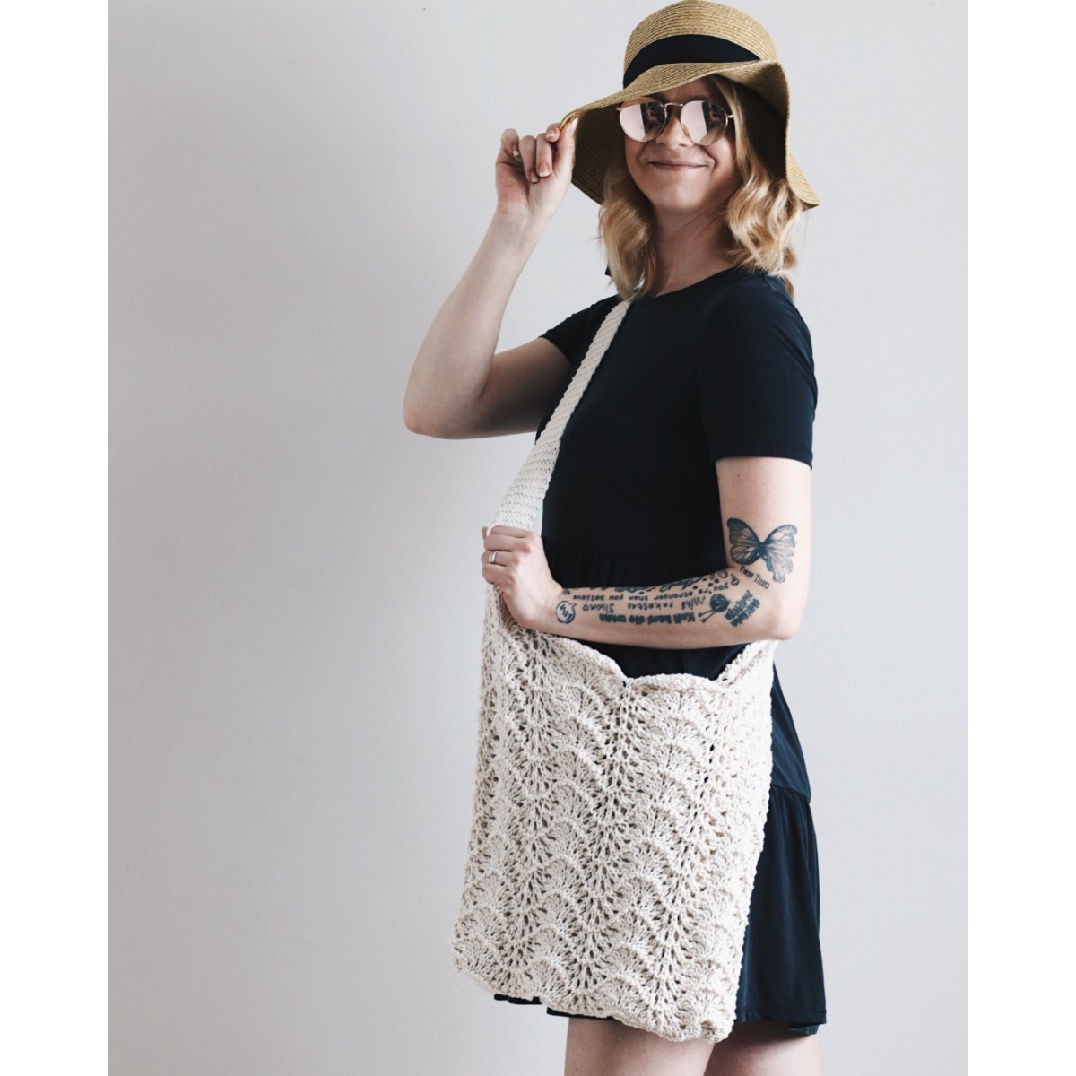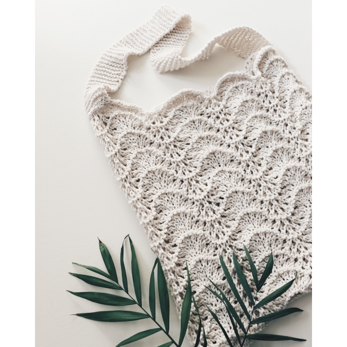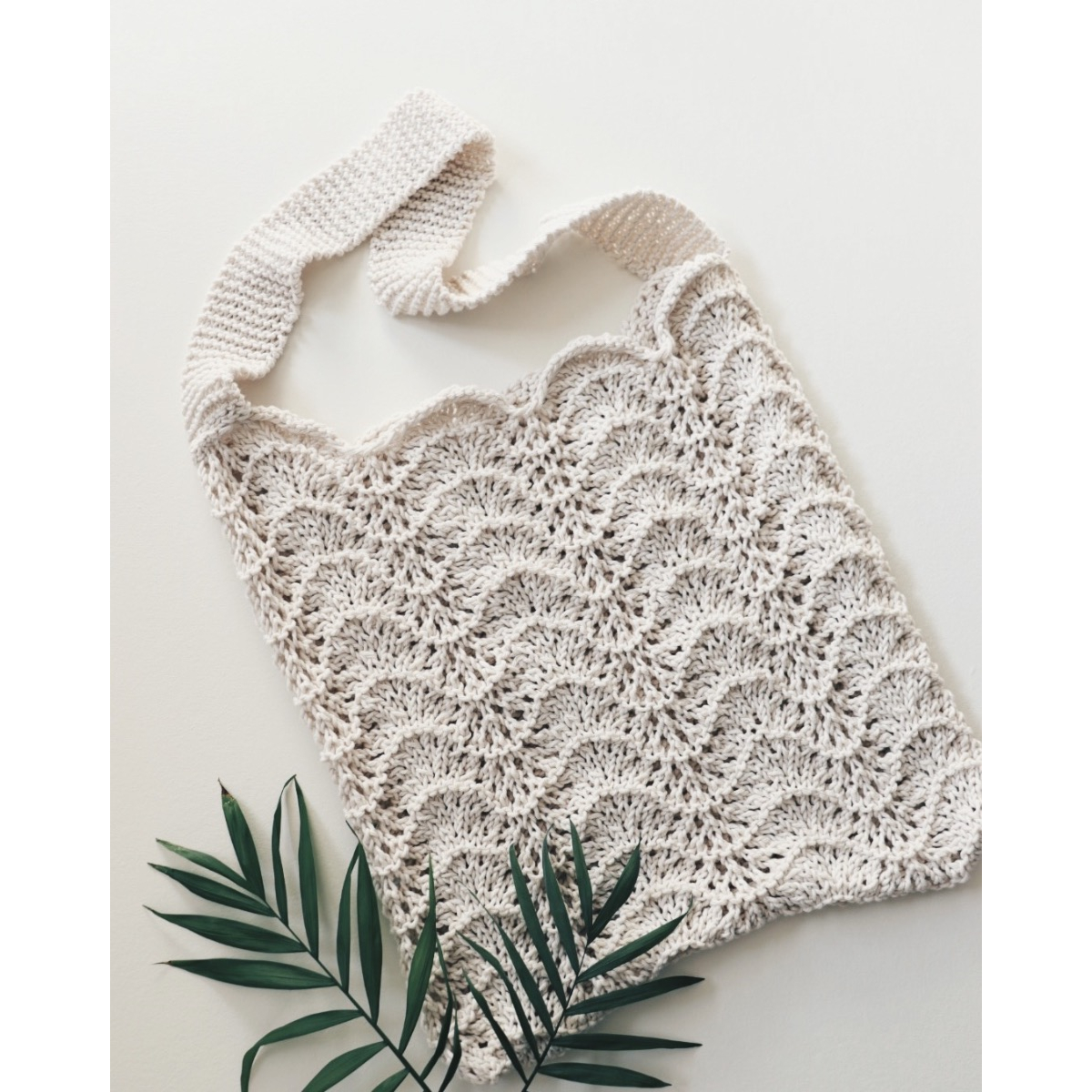 Belinda rantakassi neulotaan suljettuna neuleena kuviota toistaen. Rantakassin olkain neulotaan lopuksi.