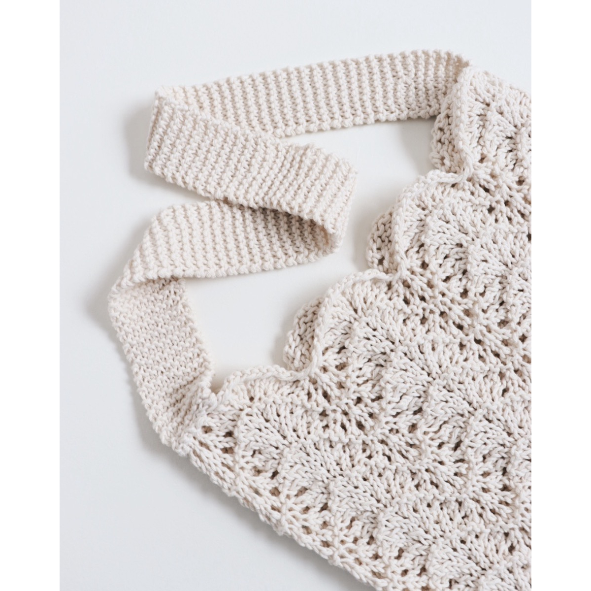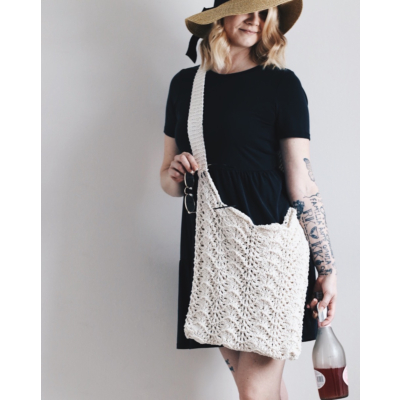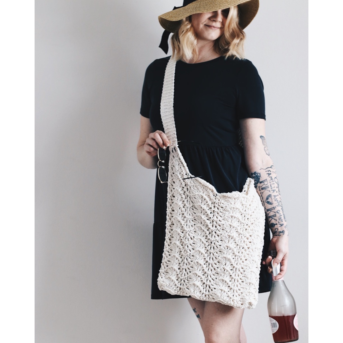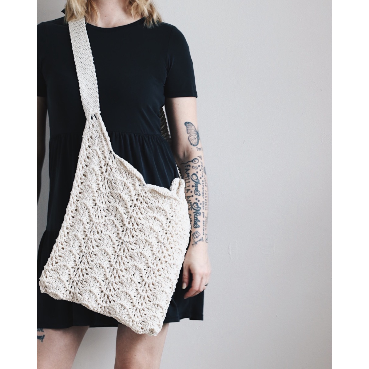Belinda rantakassi neulotaan suljettuna neuleena kuviota toistaen. Rantakassin olkain neulotaan lopuksi.