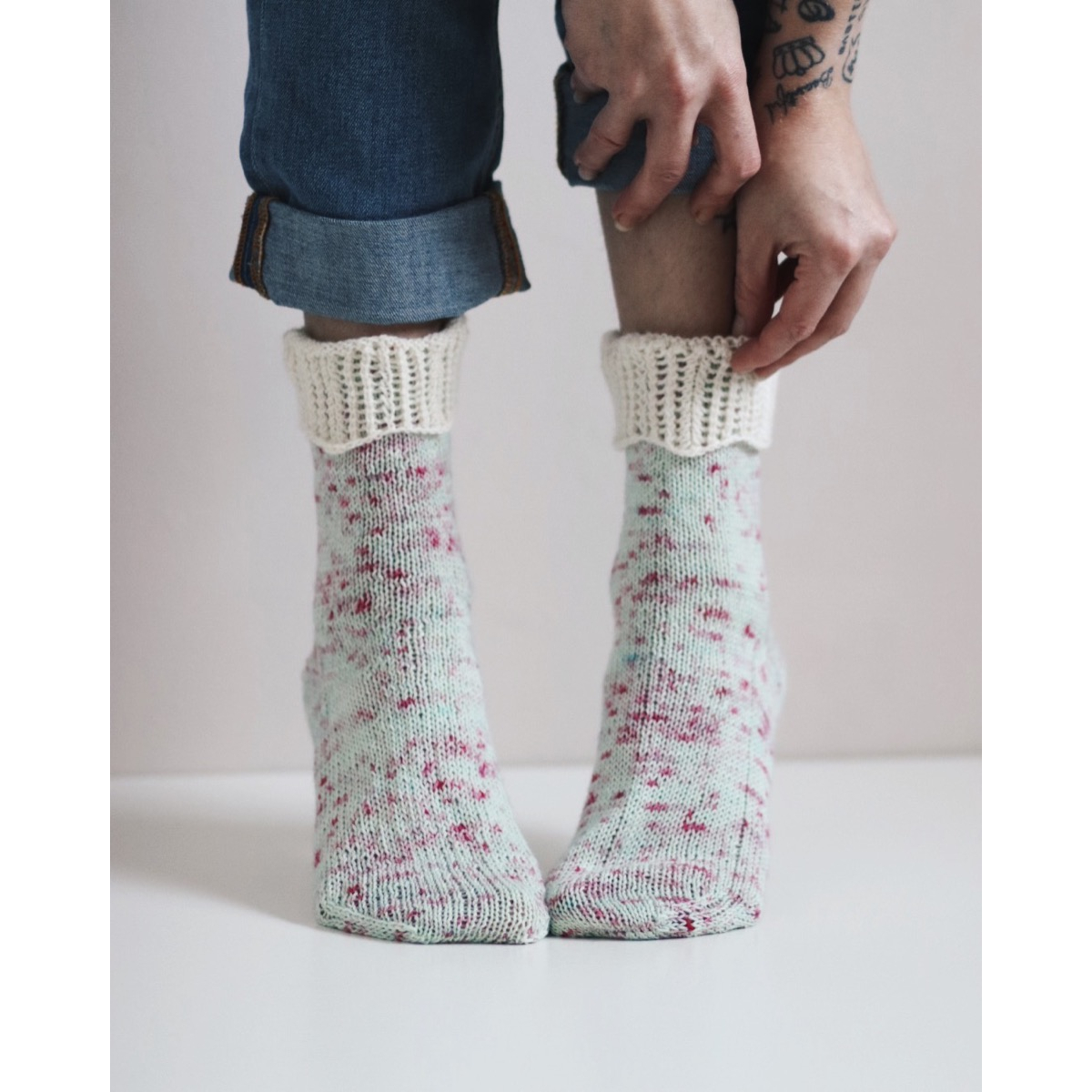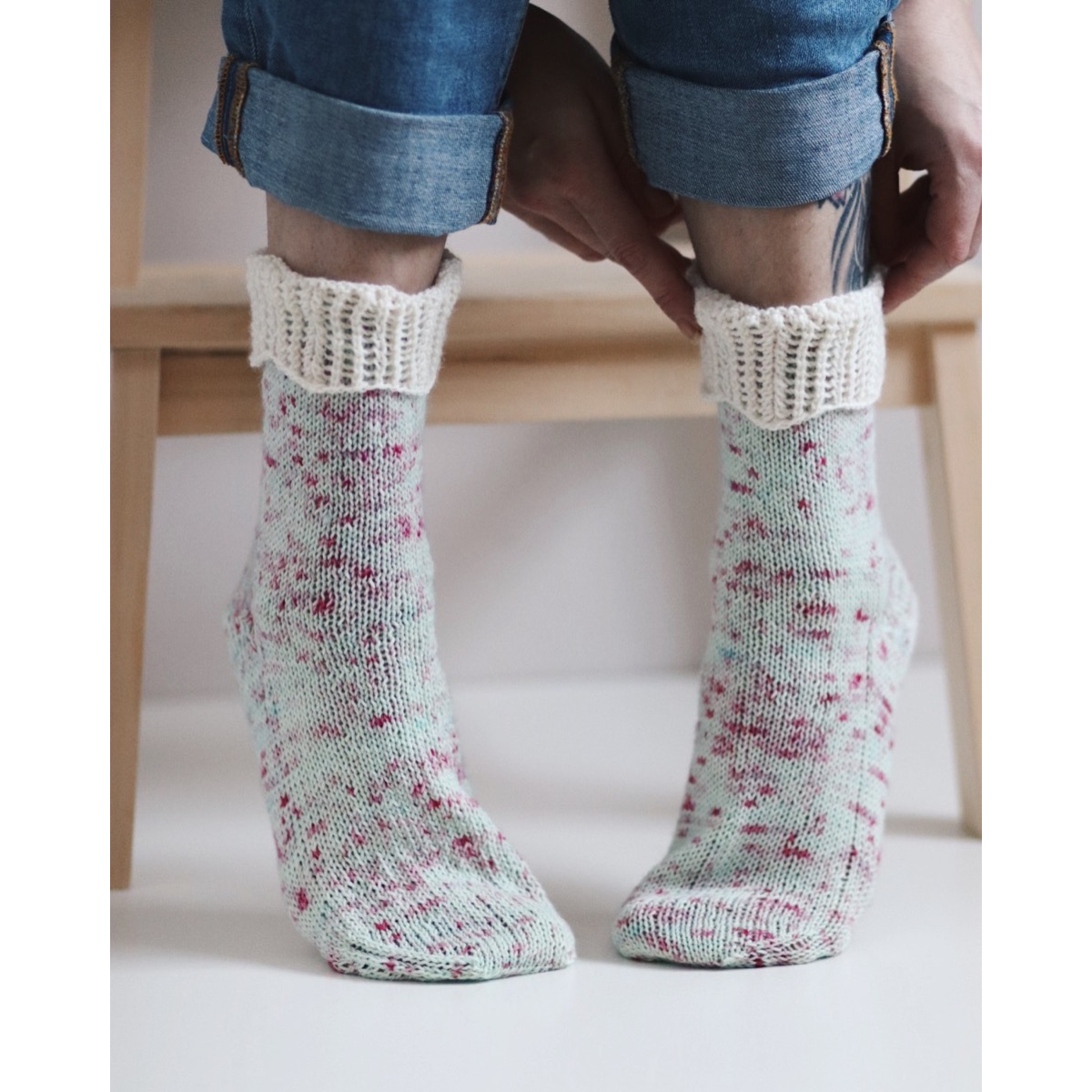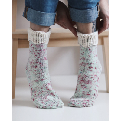 Mökkikuningatar-sukat ovat saaneet inspiraation herkullisista langoista. Pieni ”kruunu” kruunaa sukat ja antaa ihanille käsin värjätyille langoille kunniaa.