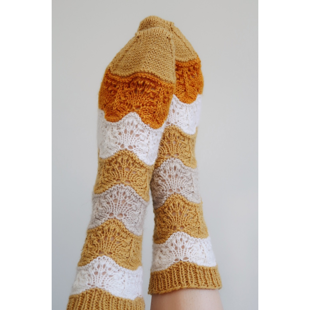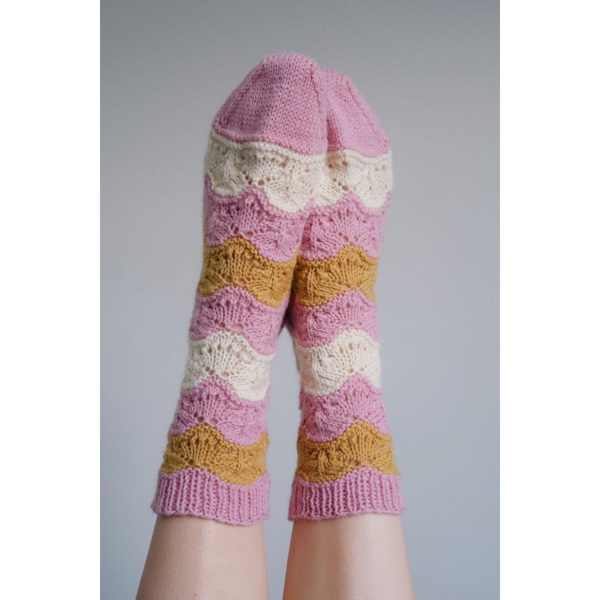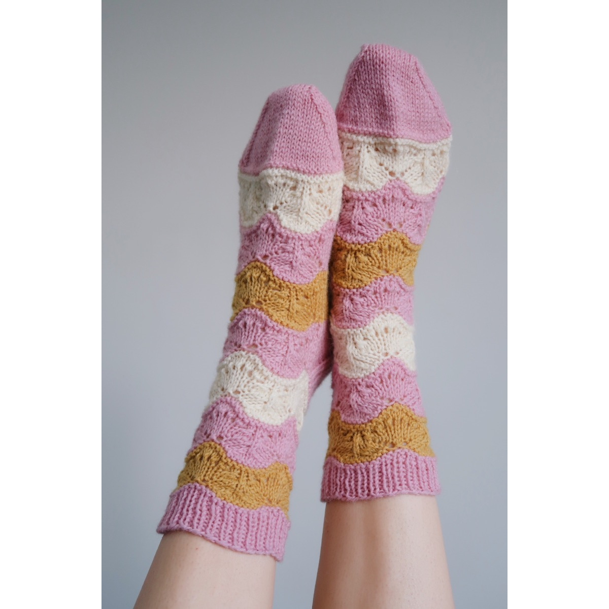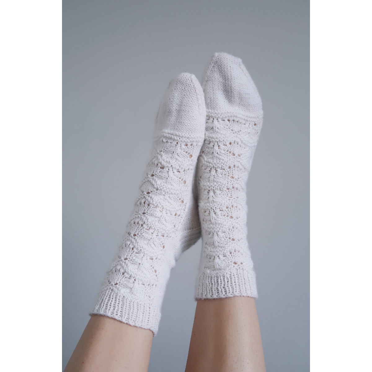 Sukkien pitsikuvio on herkkä ja kaunis. Lyhyen mallikerran ansiosta sukkia on helppo ja mukava neuloa. Mallikerran oppii myös nopeasti muistamaan ulkoa.