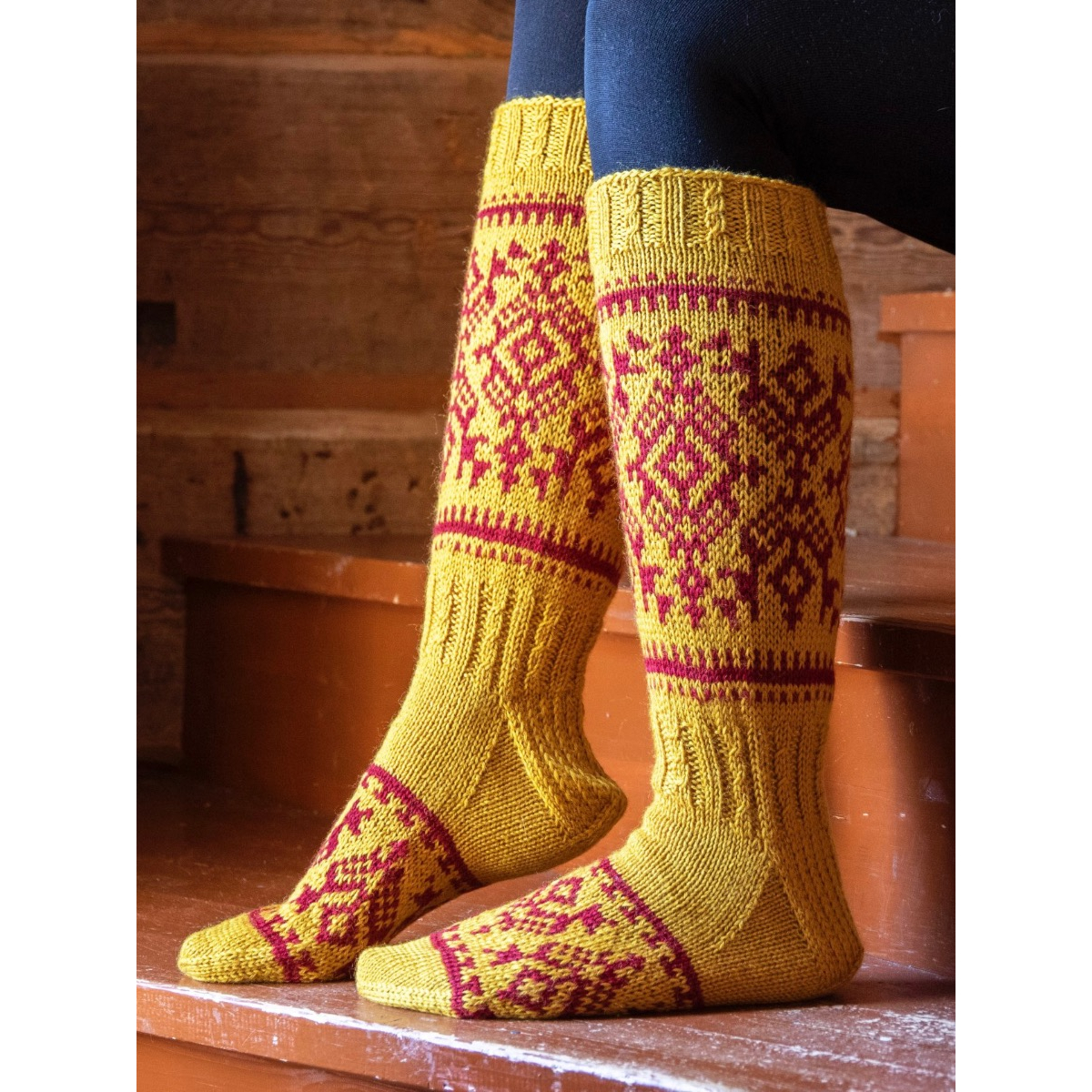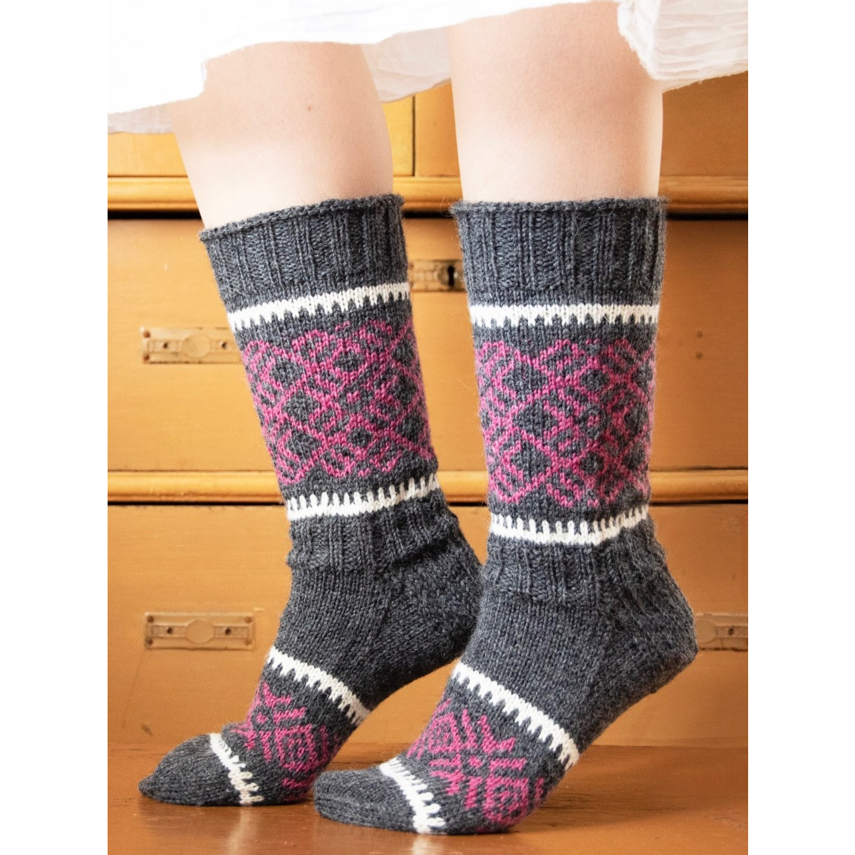 "Näitä kirjoneulesukkia suunnitellessani olen käynyt ihastelemassa karjalaisten esiäitien upeita kirjontatöitä museoiden kokoelmista. Suosittelen lämpimästi myös sinua käymään Finnassa katsomassa millaisia taidonnäytteitä sieltä löytyy https://www.finna.fi/