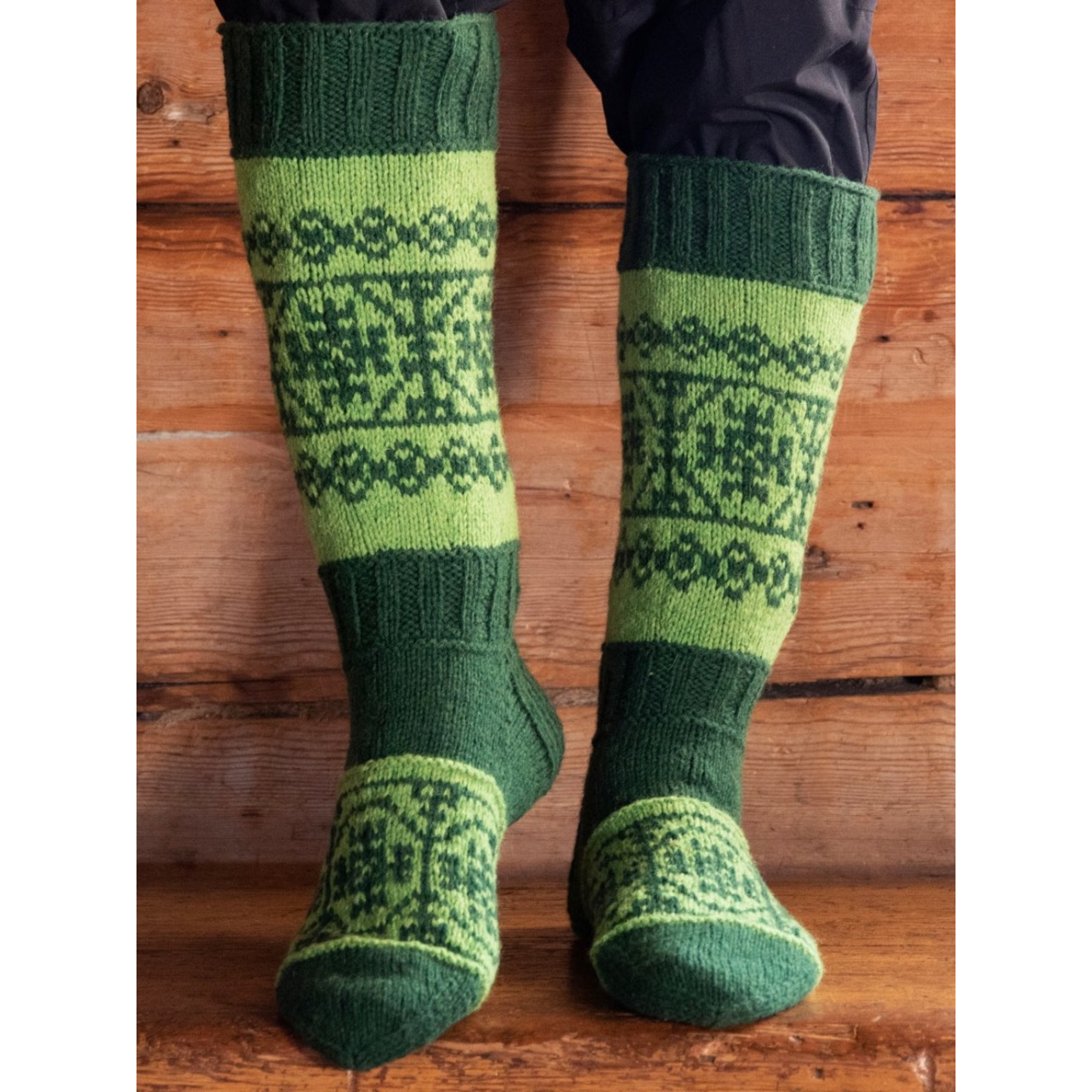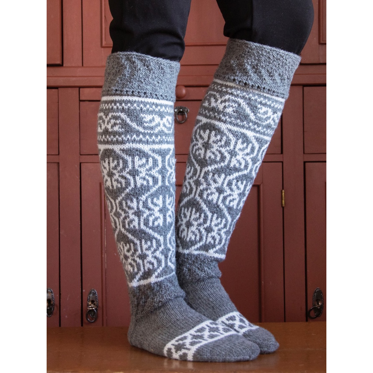 Traditio-sarjan sukkien jokaiseen pääkuvioon löytyy esikuva karjalaisesta kirjontatyöstä ja olen myös tarvittaessa niitä täydentänyt luovalla otteella täyttämään villasukan vartta paremmin. Jokaisessa ohjeessa on myös mainittu mistä kokoelmasta kuvio on otettu sekä linkki Finnaan.