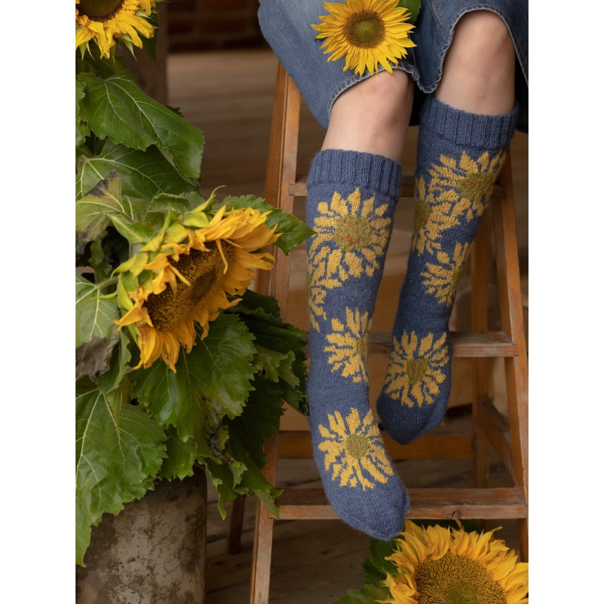 Jaana Huhtasen Villasukkia ja värssyjä -sarjaan kuuluvat Auringonkukka-sukat ovat pirteät ja raikkaat kirjoneulesukat, jotka neulotaan varresta varpaisiin.