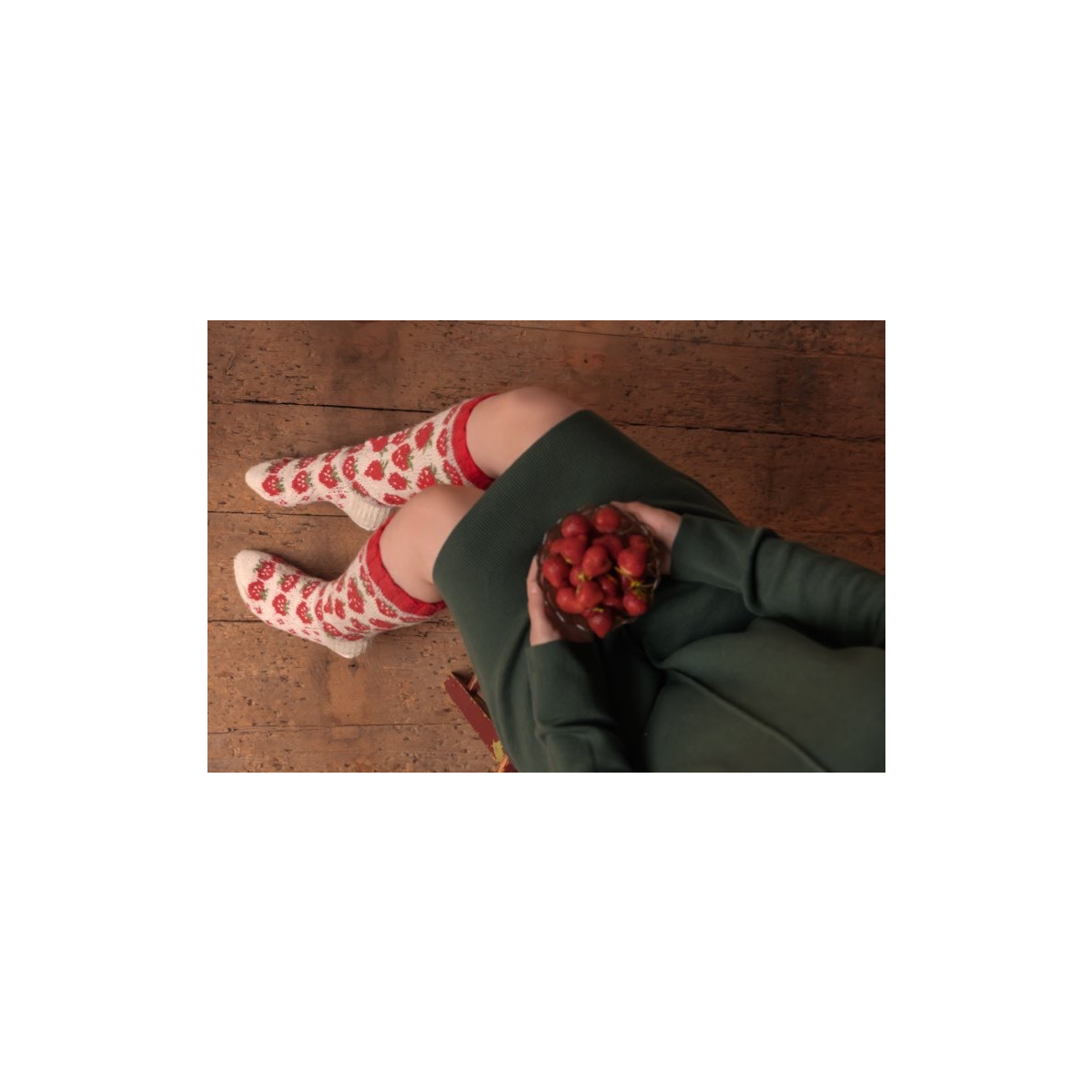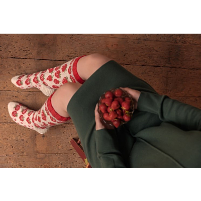 Jaana Huhtasen Villasukkia ja värssyjä -sarjaan kuuluvat Mansikka-sukat ovat kesäisen raikkaat varresta varpaisiin neulottavat kirjoneulesukat.
