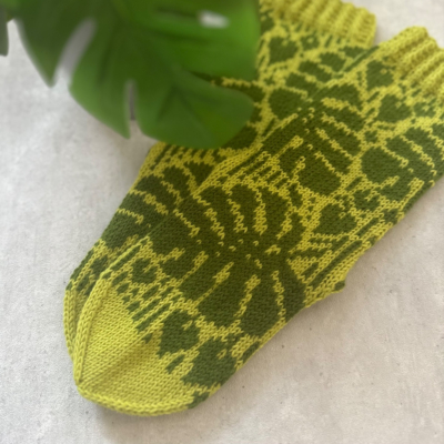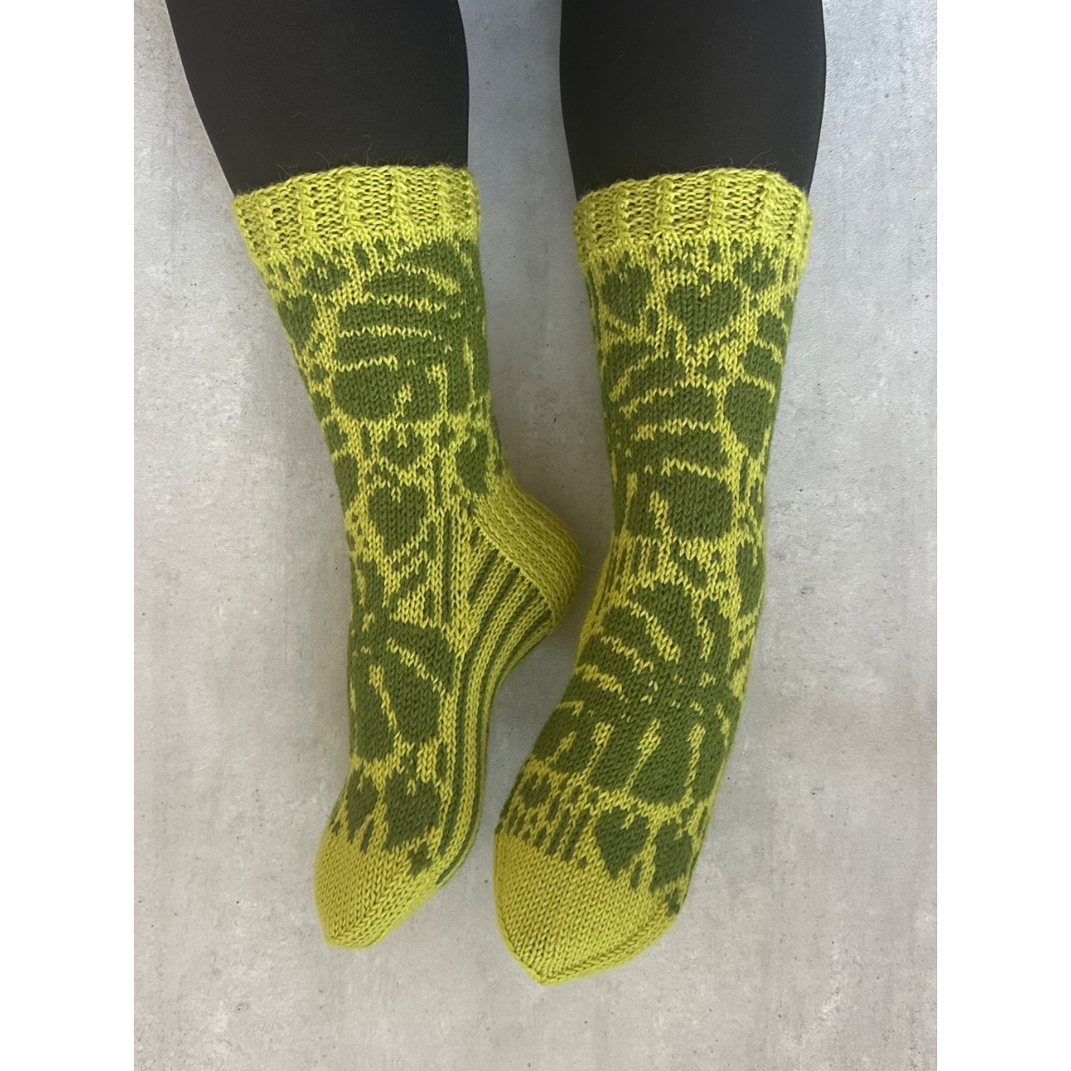Monstera-sukat neulotaan keskipaksusta sukkalangasta kuvan mukaisilla väreillä. Vahvistettu kantapää ja jalkaterän kirjoneule tekevät sukista käytössä kestävät.