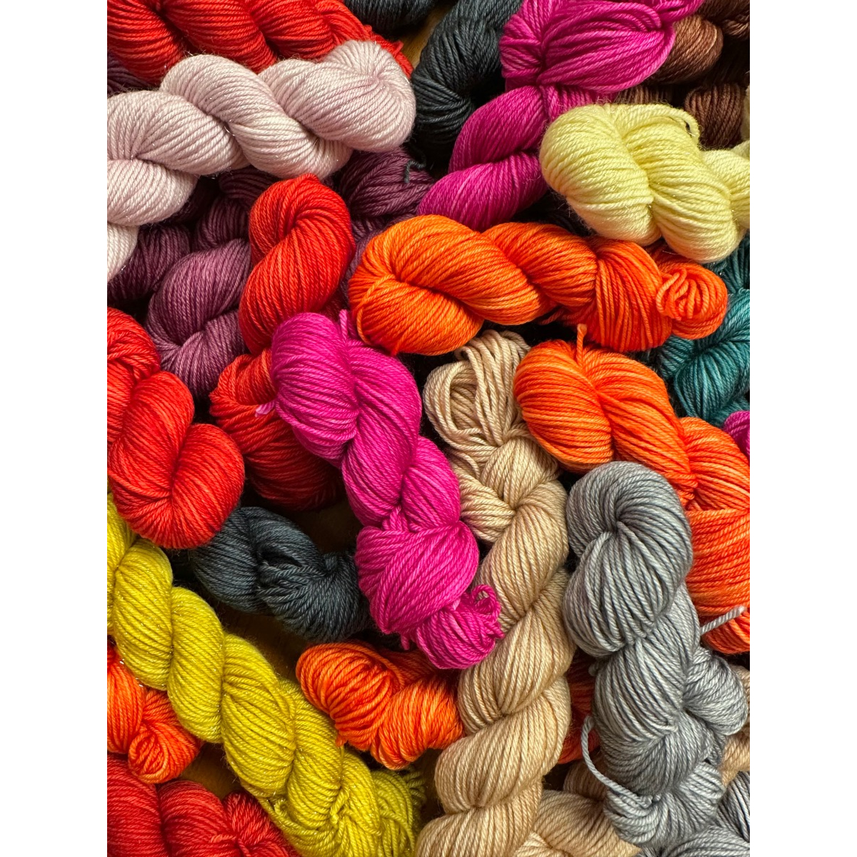 Testerit pitää sisällään yhteensä n. 30 g ohutta Aisti-lankaa yllätyssävyissä (kaikki sävyt kuitenkin olemassaolevia sävyjä nykyisestä värikartasta). Niistä ei ihan sukkaa synny, mutta toivottavasti rakkaus sinulle uuteen lankaan ja vaikkapa muutama tehosteraita tekeillä oleviin sukkiin/lapasiin.