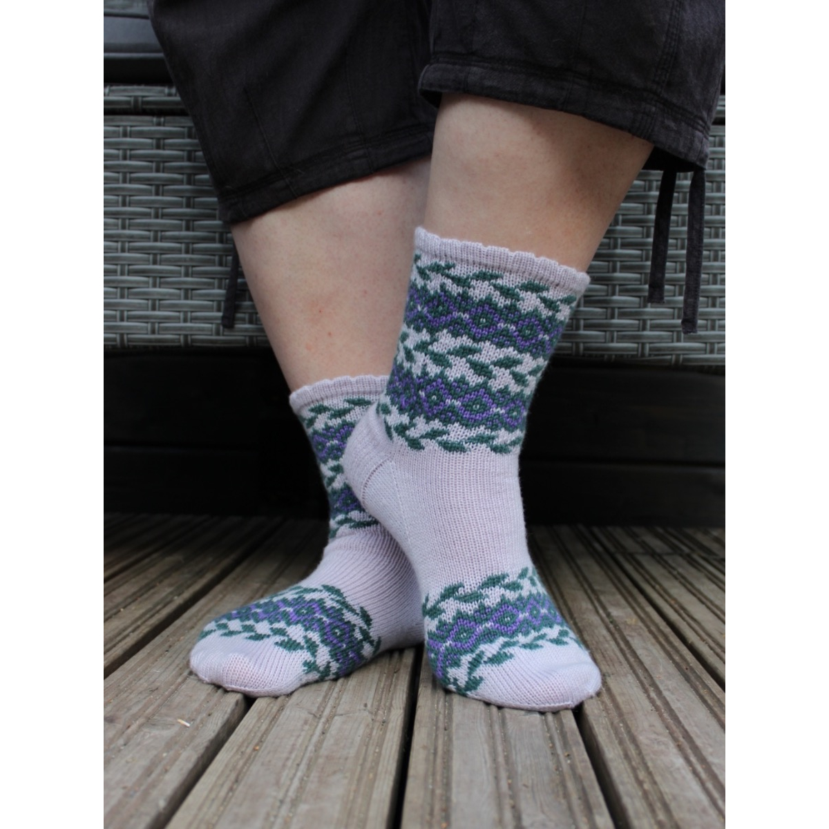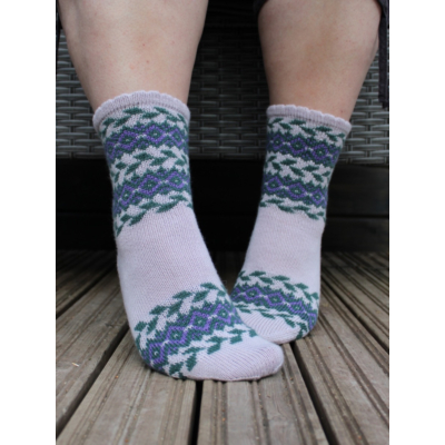 Clematis sukat ovat tyylikkäät, romanttishenkiset sukat, joissa on kaunis kirjoneulekuvio varressa sekä terässä. Sukissa on taitettu piparkakkureunus ja ranskalainen kantapää. Sukkien kirjoneuleosioon voi käyttää jämälankoja ja terän pituus on täysin säädettävissä omaan jalan kokoon sopivaksi.