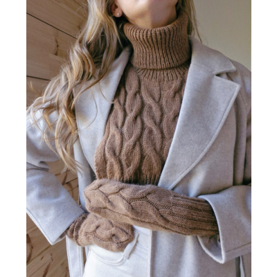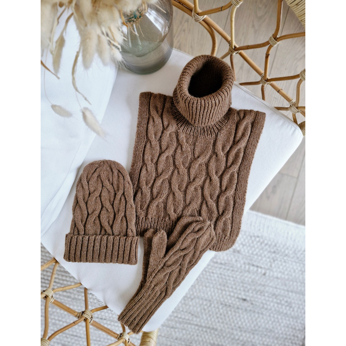 Aurora-neuleasustesetti neulotaan DK-vahvuisesta langasta 4 ja 4,5 mm puikoilla. Lankaa tarvitset yhteensä 450 g. Kuvan ruskea neulesetti on neulottu Dropsin Lima-langasta sävyssä manteli.