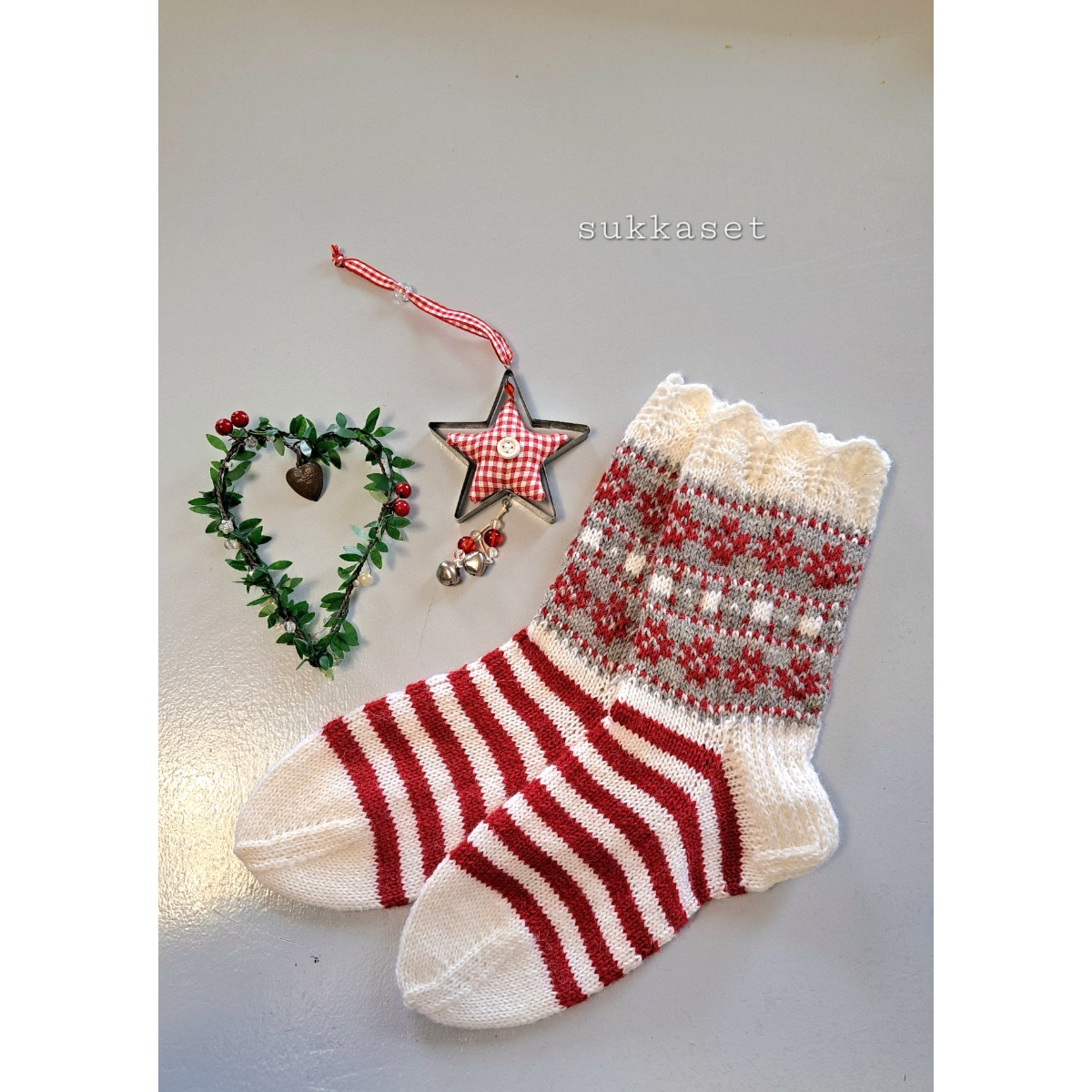 Ihanat kirjoneulesukat jouluisissa väreissä. Vaihtamalla värit sukka mukautuu toiseen tunnelmaan. Teräosan pituutta voi helposti säädellä ohjekokoja isommaksi, jos sukan varren leveys riittää.
