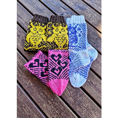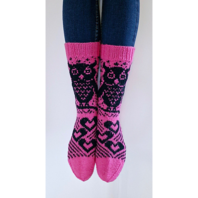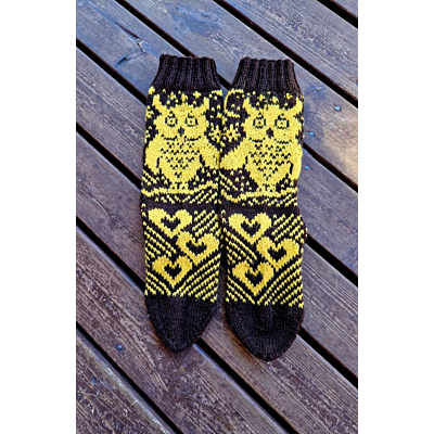 Pöllörakkautta sukat neulotaan varresta varpaisiin. Kun sukat laittaa jalkaan, näkee pöllöjen pitävän kiinni toisistaan. Pohjaväriksi sopii hyvin tumma tai vaalea lanka.