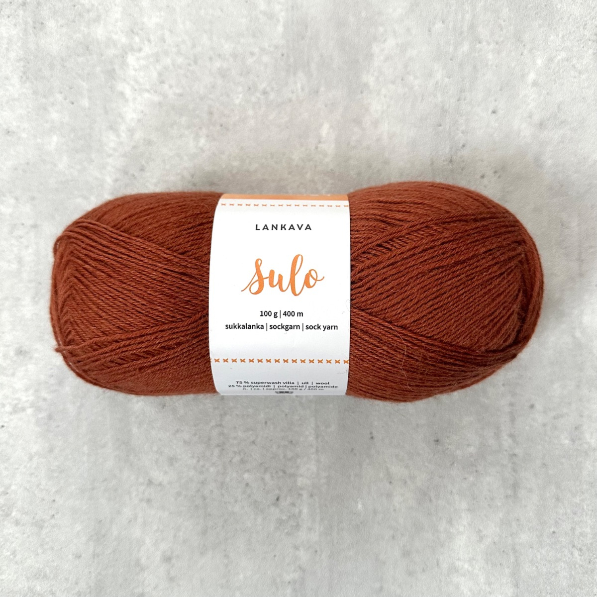 Sulo-sukkalanka on Lankavan oman sukkalankaperheen ohuin sukkalanka. Se on nelisäikeinen ja sen valmistuksessa on käytetty konepestävää Superwash-villaa 75 % ja kulutuskestävyyden varmistamiseksi siihen on lisätty 25 % polyamidia. 100 g kerässä on lankaa n. 400 metriä ja puikkosuositus on 2-3 mm. Sulo-sukkalangasta valmistuvat sukat sopivat kenkään ja jokapäiväiseen käyttöön. Neulo lämpimät villasukat itselle, perheelle tai lahjaksi! Suloiset pitsisukatkin valmistuvat tästä ohuesta sukkalangasta. Sulo-sukkalanka sopii loistavasti myös muihin neulevaatteisiin.