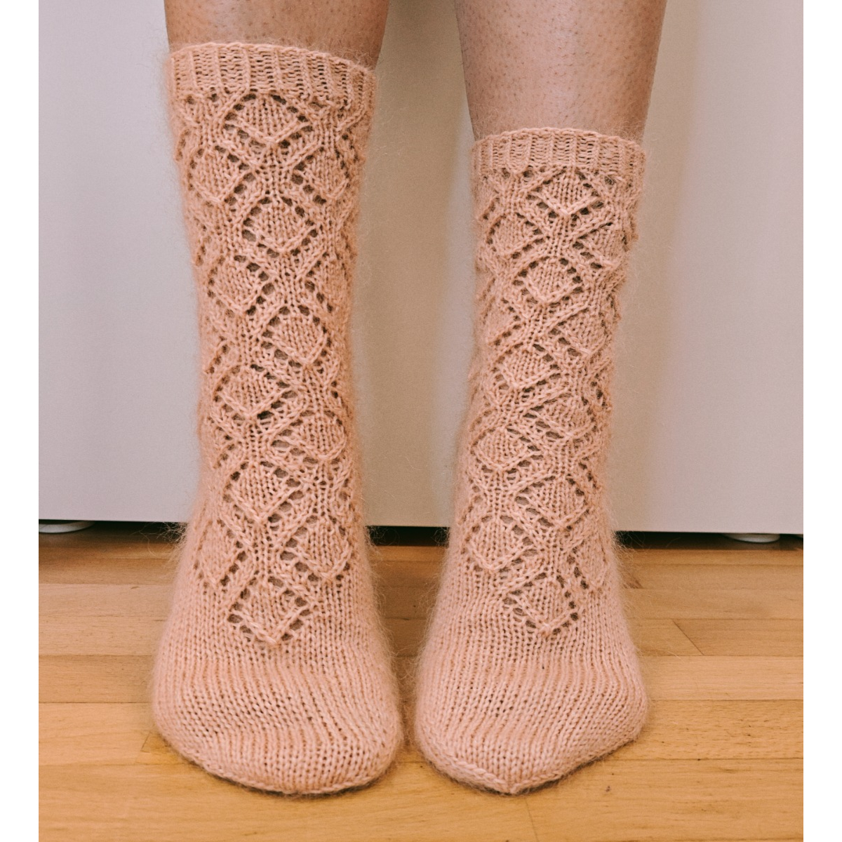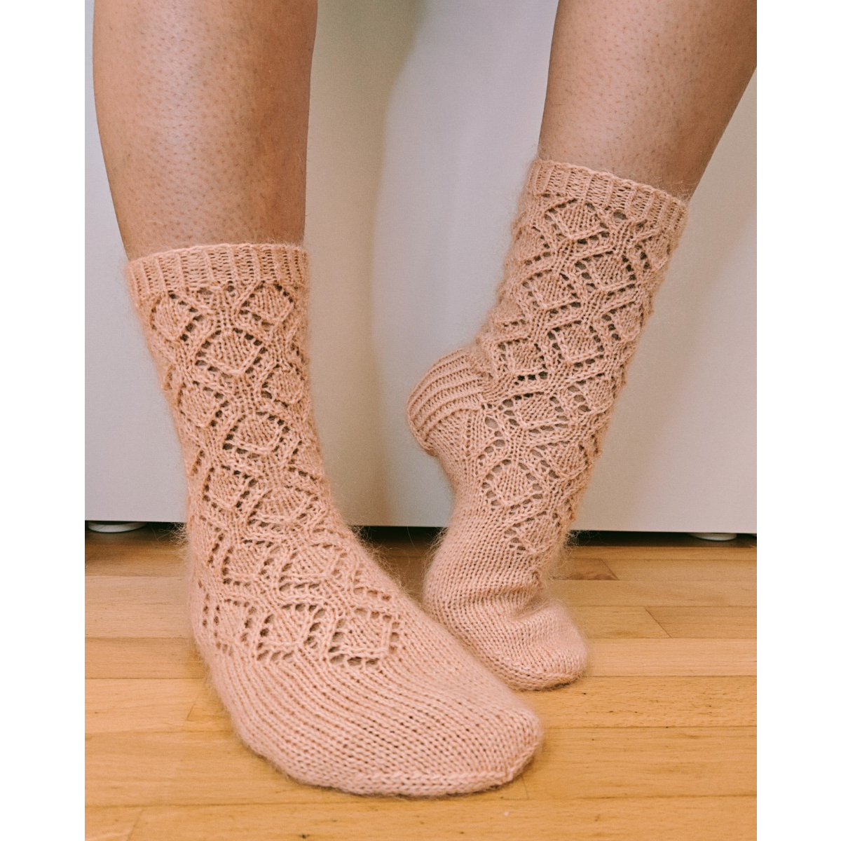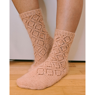 Line Socks -mallin pitsikuvio on sama kuin Line Tee- ja Line Sweater -malleissa. Sukat voi neuloa joko kaksinkertaisella langalla (fingering + lace/mohair) tai yksinkertaisella sport-vahvuisella langalla.