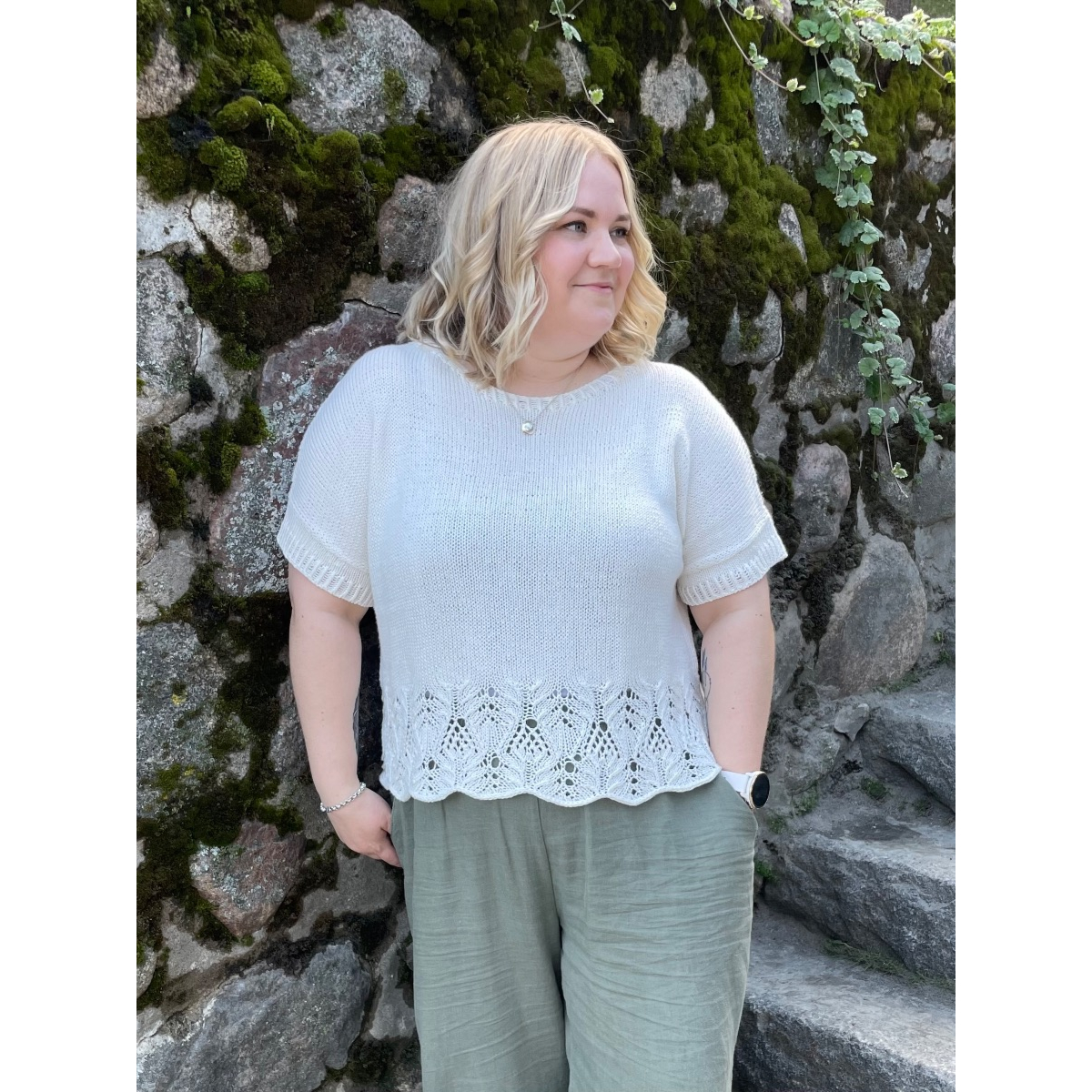 Lotus Lake t-paita on lyhyt ja laatikkomallinen paita, jonka helmaa koristaa herkkä pitsikuvio. Lyhennetyin kerroksin muotoiltu, pudotettu hartialinja ja kainalomuotoilut tekevät tästä mallista hyvin istuvan ja monelle vartalotyypille sopivan. Ohjeessa on yksitoista eri kokoa (84–160 cm rinnanympäryksellä) sekä ohjeet hihansuun muokkaamiseen omia mittoja vastaavaksi. Suositeltu väljyysvara on 2,5–10 cm.