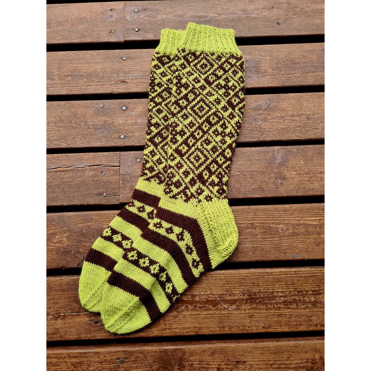 Metsäpolku-kirjoneulesukat neulotaan ohuesta langasta. Varren kuvio on innostava neuloa ja vaatii hieman keskittymistä.