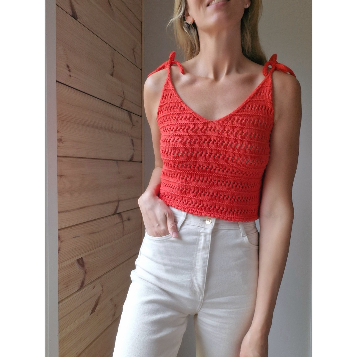 True Love-neuletoppi vie boheemiin kesätunnelmaan herkällä pitsikuviollaan. V-pääntie ja solmittavat nyöriolkaimet tekevät topista todellisen katseenkääntäjän. True Love -neuletoppi sopii kauniisti niin shortsien, housujen kuin hameen pariksi. Tässä neuletopissa voit tuntea itsesi tyylikkääksi arjesta juhlaan.