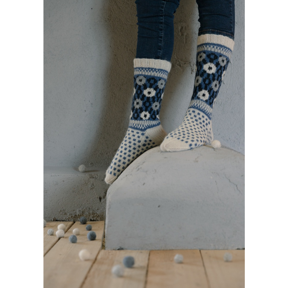 Jaana Huhtasen Villasukkia ja värssyjä -sarjaan kuuluvat Lumipallot-sukat ovat kirjoneuletta ja neulotaan varresta varpaisiin.