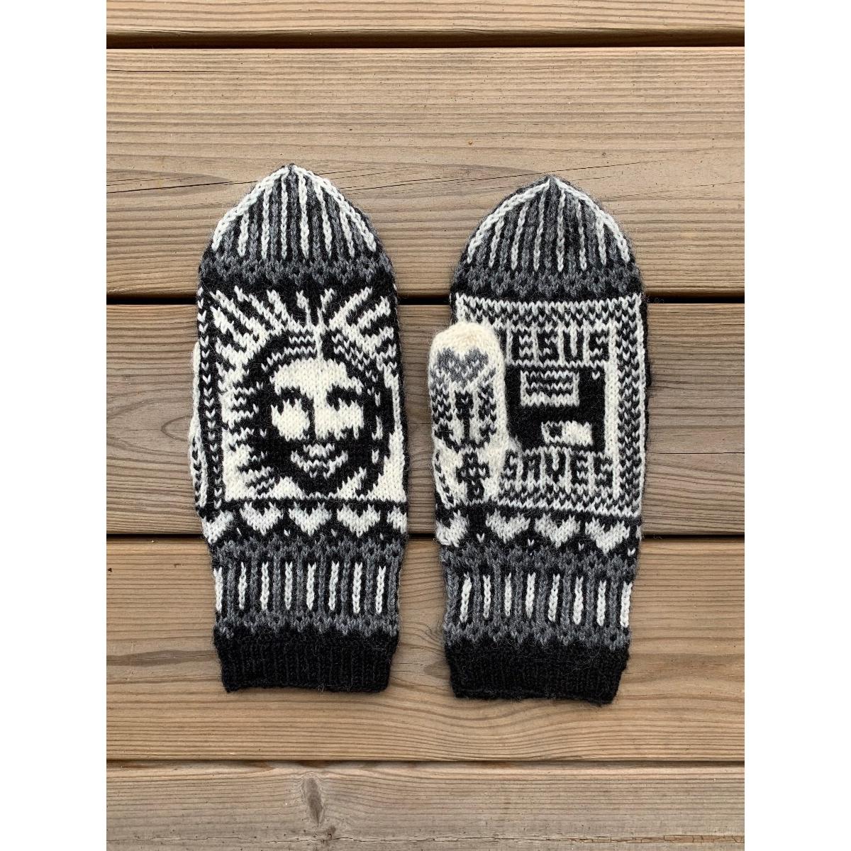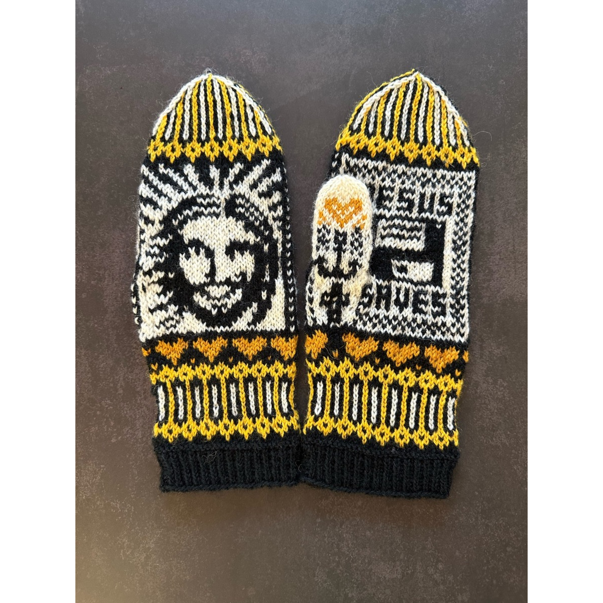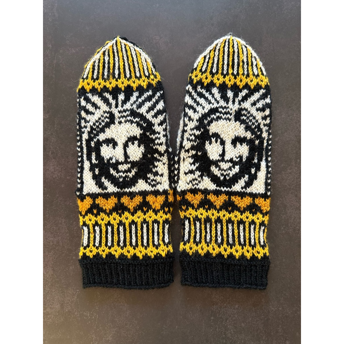 Huumorilla ja taiteellisilla yksityiskohdilla höystetyt kirjoneuleet ovat Lumi Karmitsan "tuotemerkki", eivätkä nämäkään lapaset jätä kylmäksi!
