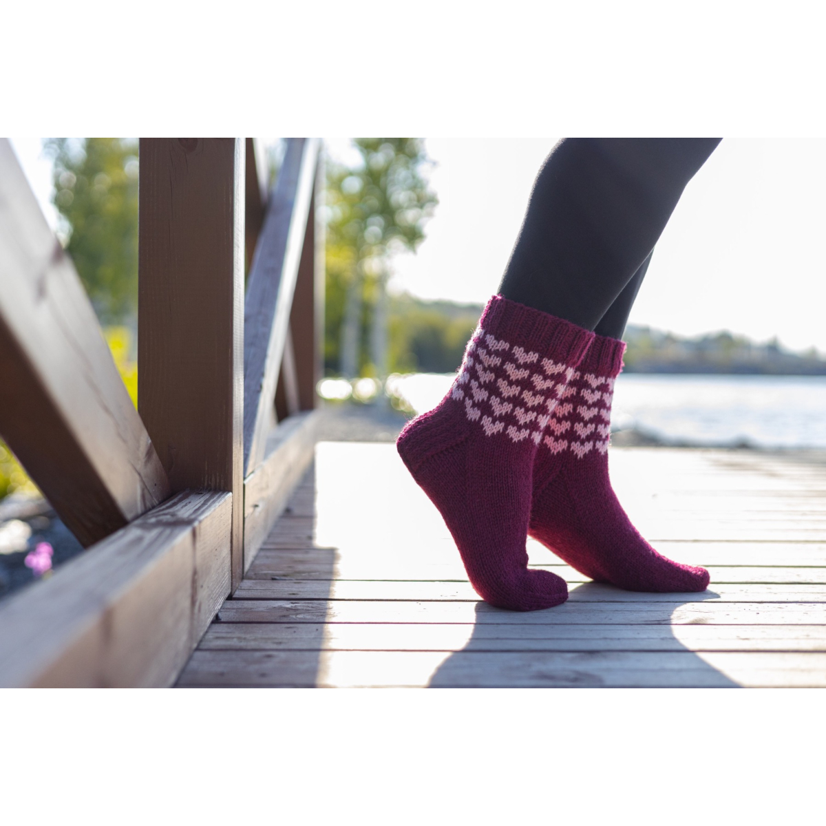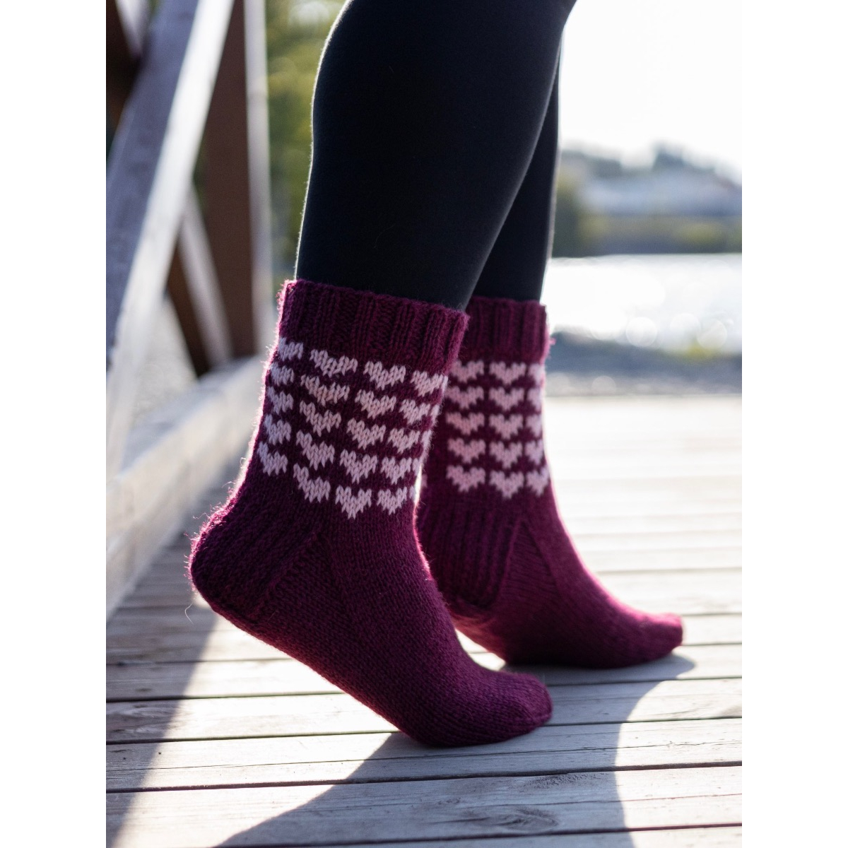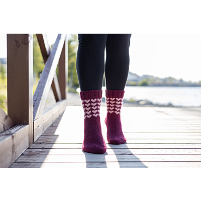 Sydämelliset ovat osa Jokapäivänsukat-mallistoa, ja ne neulotaan normaalipaksuisesta konepestävästä sukkalangasta. Varren pituus on noin 20cm kantapään alta, ja sukissa on vahvistetut kantapäät.