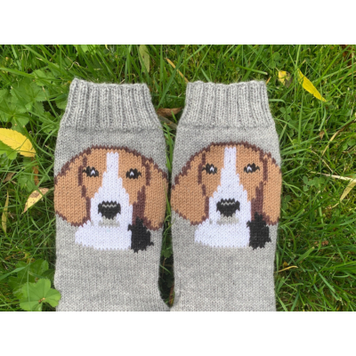 Sukat tehdään konepestävästä keskipaksusta sukkalangasta, ja pohjavärinä on keskiharmaa mistä koiran kuva erottuu hyvin ja pääsee oikeuksiinsa. Varren pituus kantapään alta on joka koossa noin 25cm jotta koiran kuva mahtuu varteen hyvin.