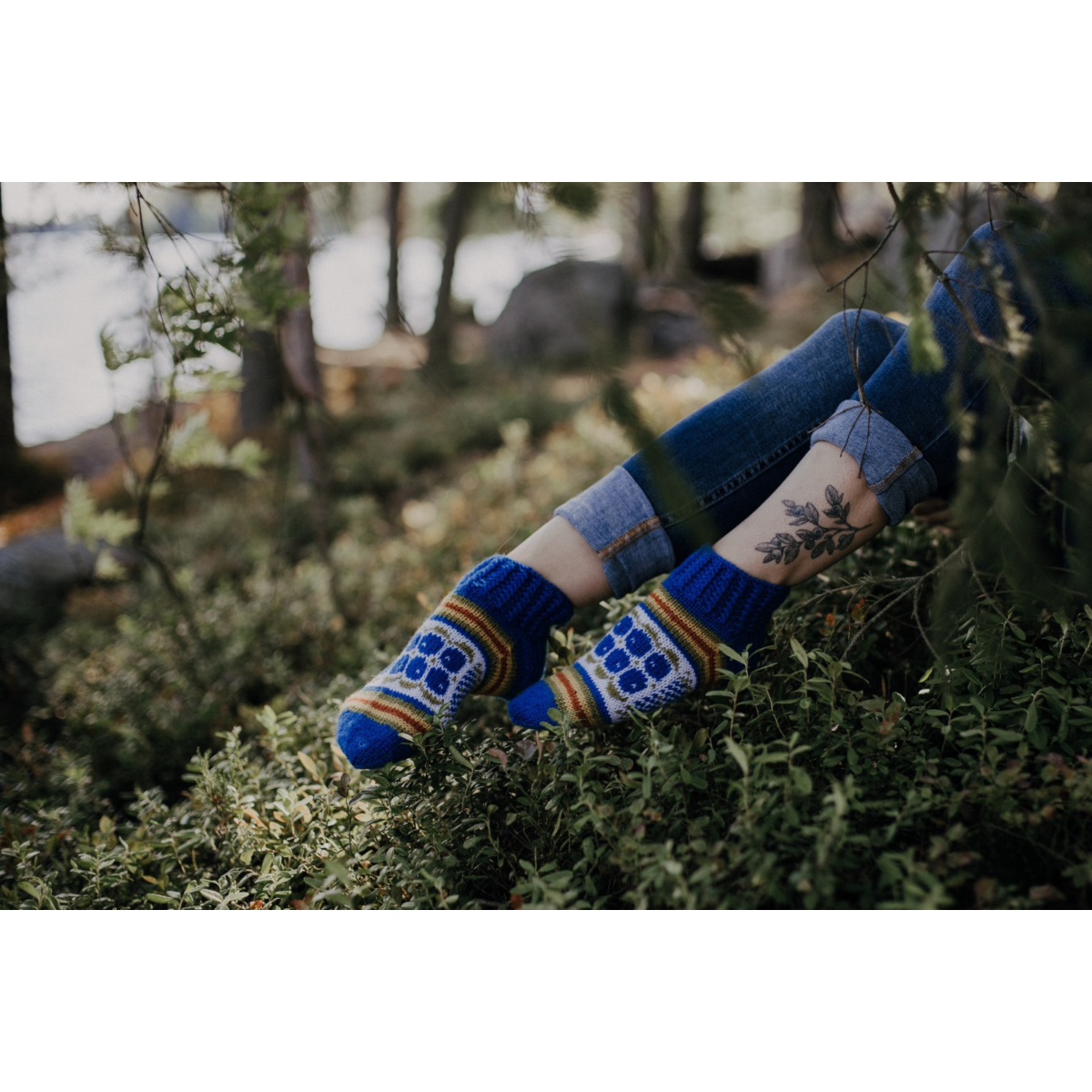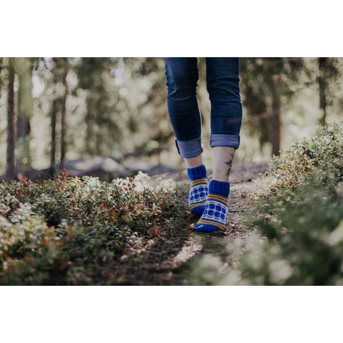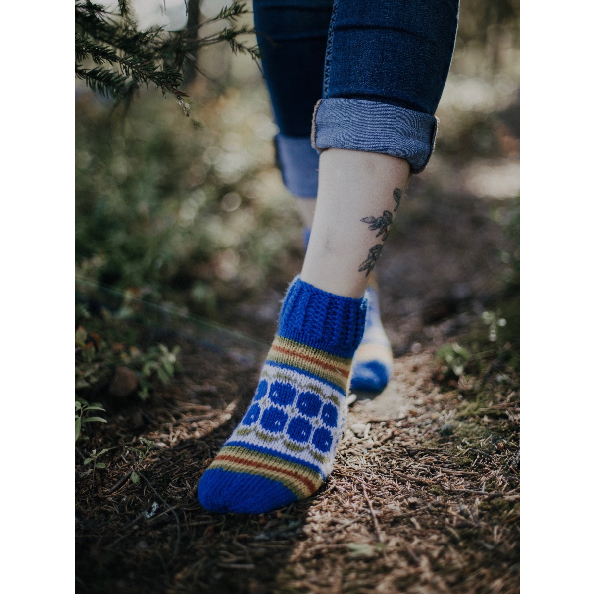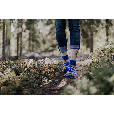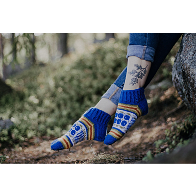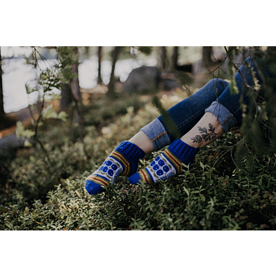 Mustikkaiset on kesäinen nilkkasukkamalli, ja sopii erinomaisesti vaikkapa mökkisukiksi, tai kesämekon kanssa asusteeksi. Sukat neulotaan keskipaksusta konepestävästä sukkalangasta, ja väritys on tuotekuvien mukainen.
