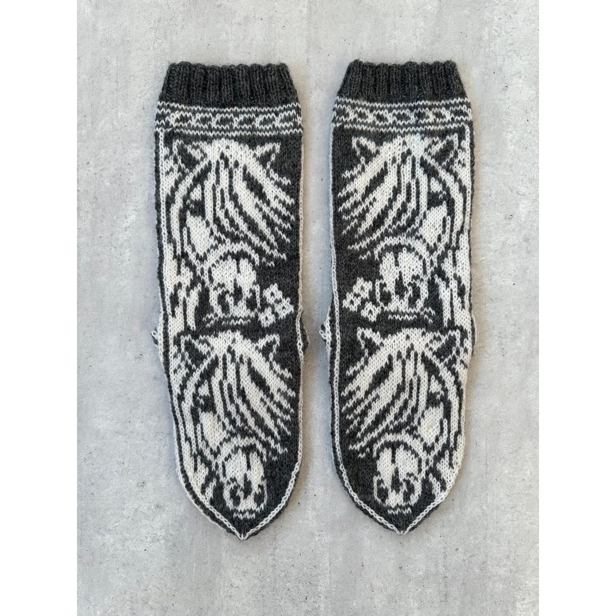 Tämä lyhyempi versio Liinaharjasukista lämmittää jokaisen hevosten ystävän jalkoja ja sydäntä! Edessä komeilevat hepat ja varren takaosassa on koristeellinen hevosenkenkäkuvio. Sukat tehdään ohuesta konepestävästä sukkalangasta.
