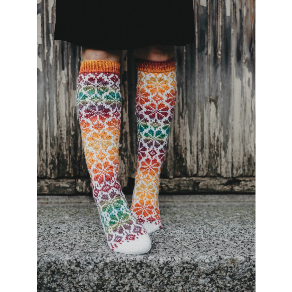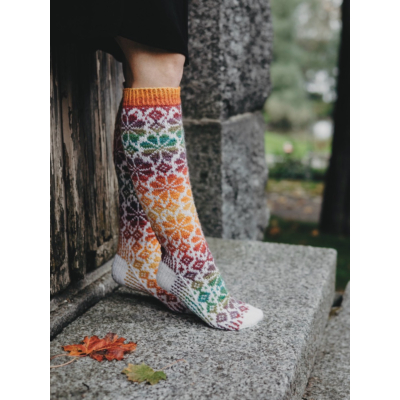 Niittykukkia-sukat neulotaan kuvan mukaisissa väreissä; pohjavärinä valkoinen ja kuviovärinä monivärinen liukuvärjätty lanka. Kuvioväri asettuu jokaisessa sukassa vähän eri tavalla, joten aivan identtisiä eivät mitkään kaksi sukkaa ole.