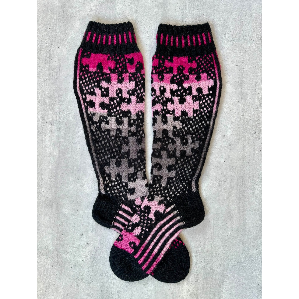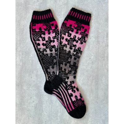 Palapelisukat on Kati Mäkelän leikkisä malli, jonka ohje ilmestyi Villasukkabuffet-kirjassa. Sukat neulotaan keskipaksusta konepestävästä sukkalangasta, kuvan mukaisissa väreissä.