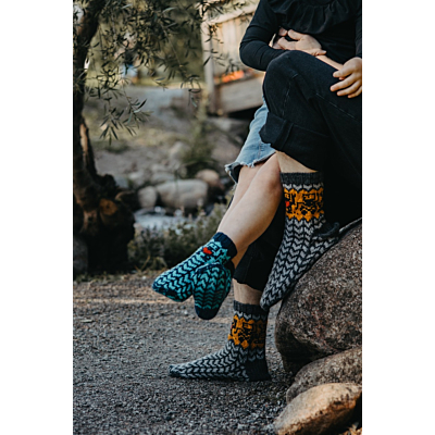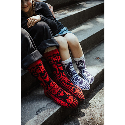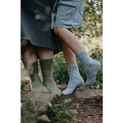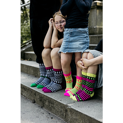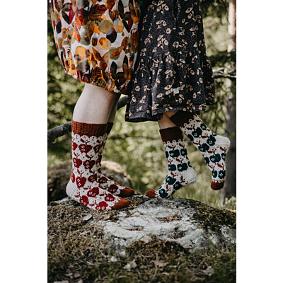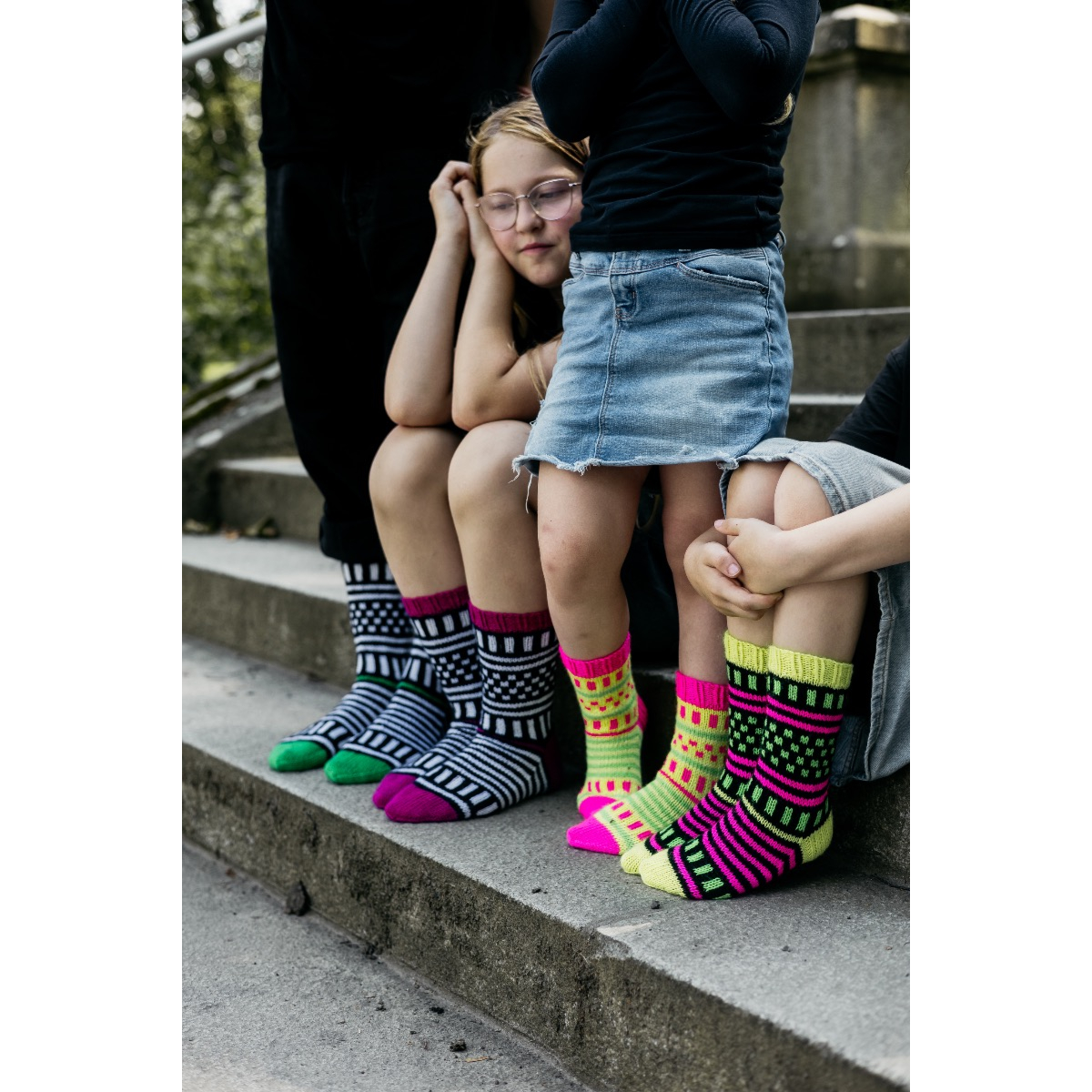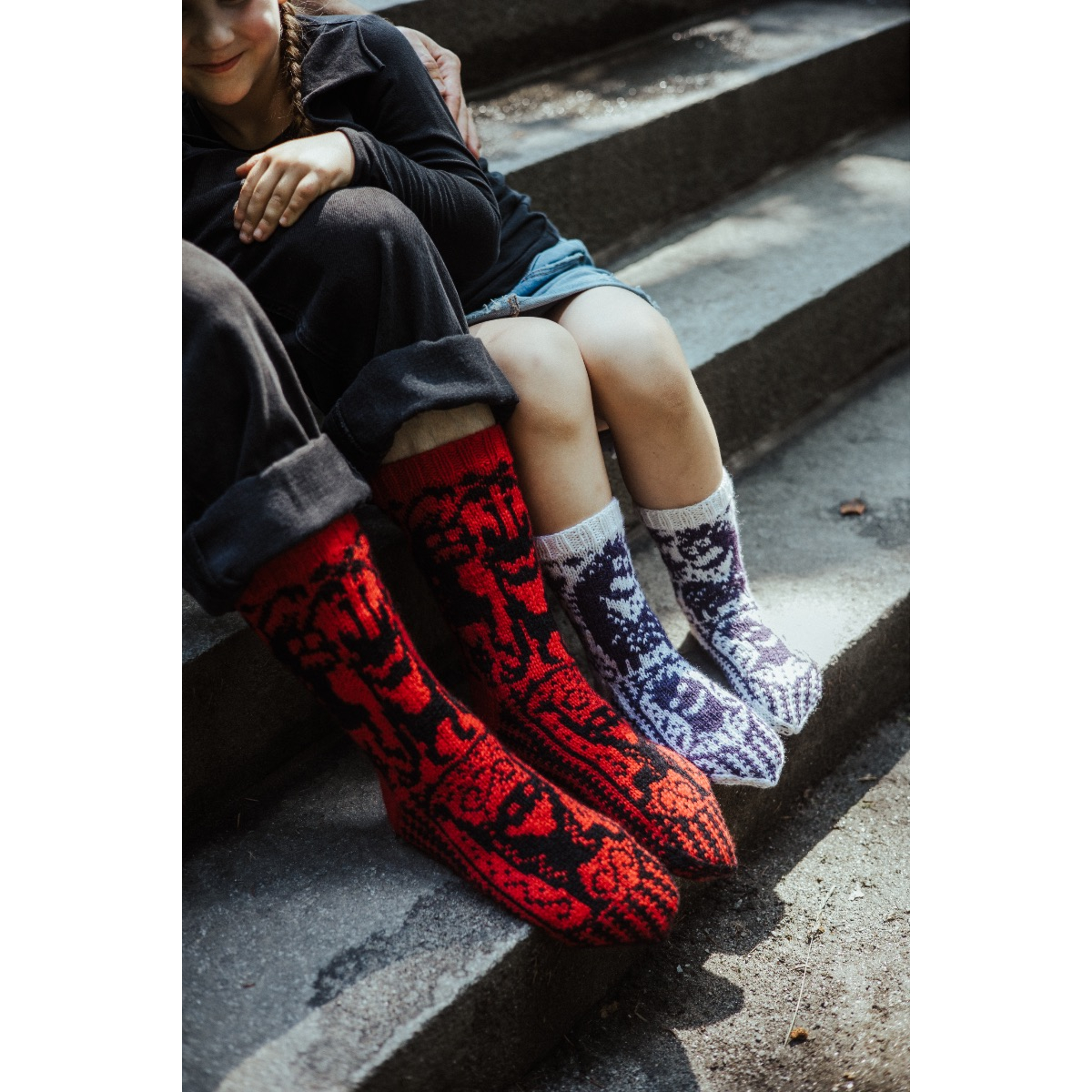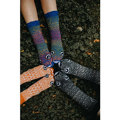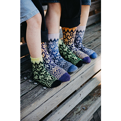 Viiden eri suunnittelijan luomat leikkisät aiheet ovat takuulla monenlaisen sukankäyttäjän mieleen, ja pääsetkin neulomaan muun muassa mörköjä, omppuja ja tähdenlentoja.