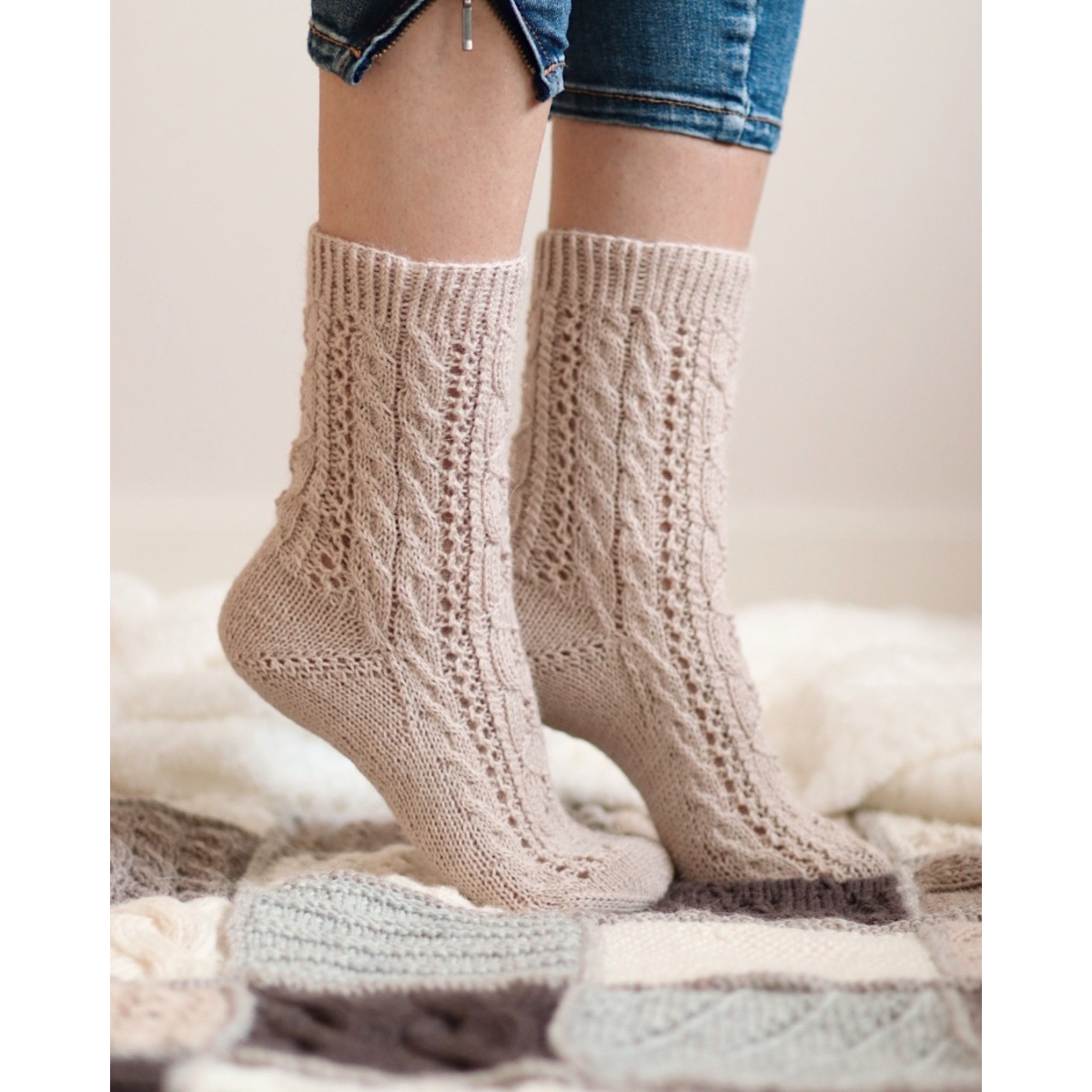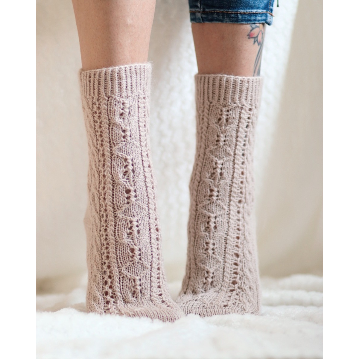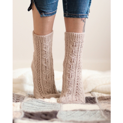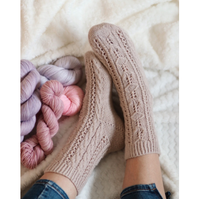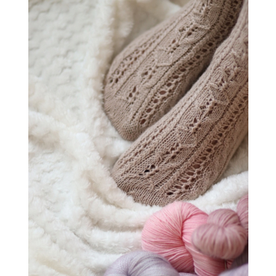 Amore-sukat neulotaan varresta varpaisiin toistaen palmikkokuviota varressa ja jalkapöydän päällä.