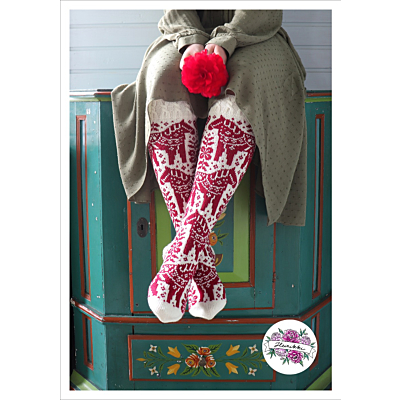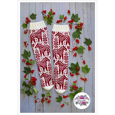 The 21-pages long PDF-knitting pattern includes good charts, written instructions and photos. The pattern includes two sizes for the leg. The socks are knitted as a mirror-image from each other, so the pattern includes charts for left and right leg.