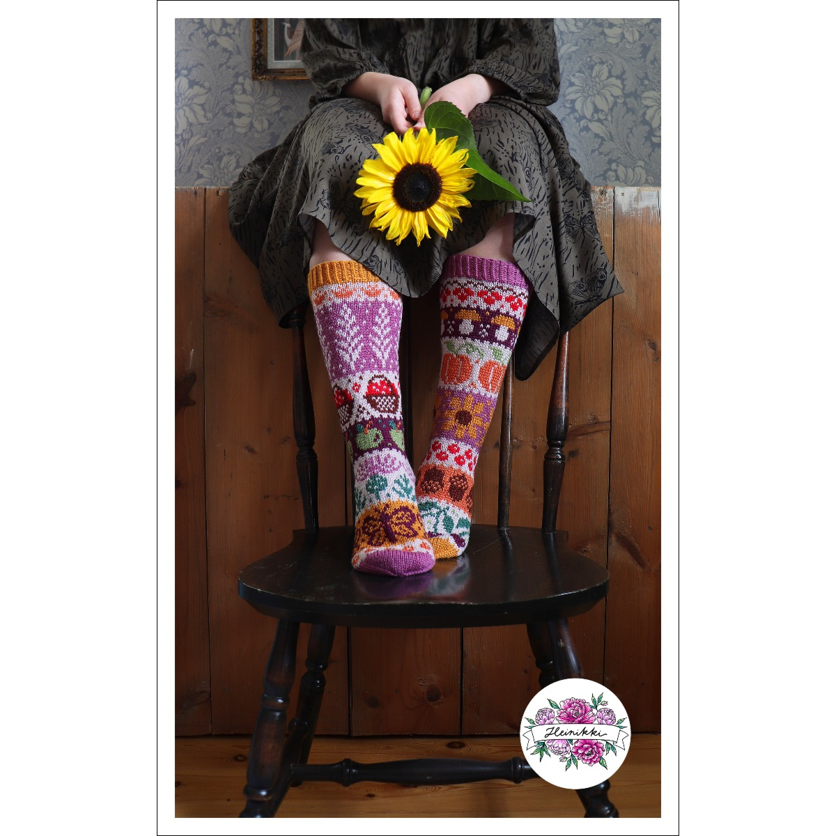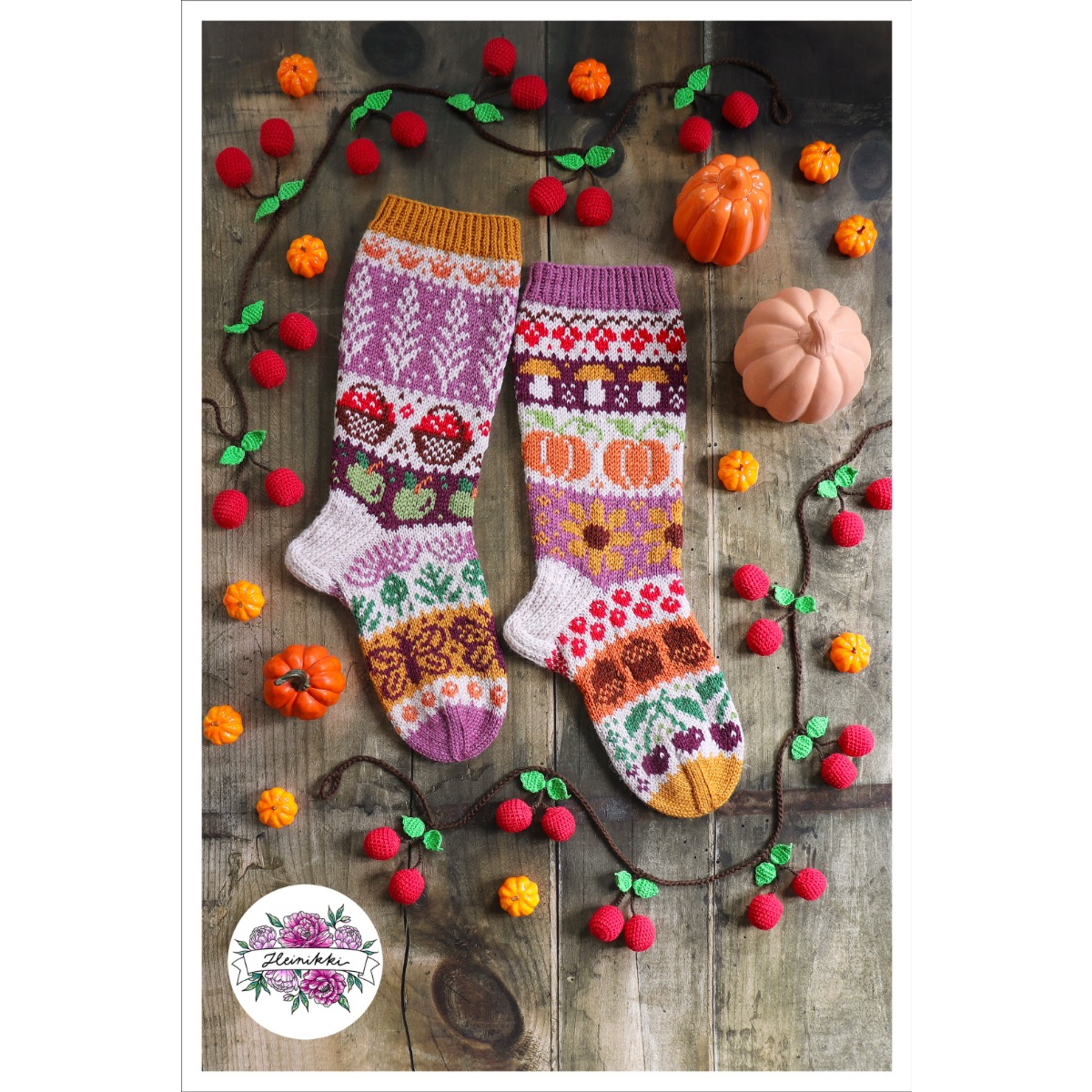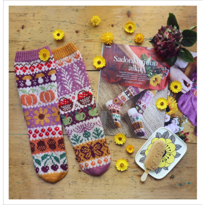 Heini innostui sadonkorjuuaiheesta niin kovasti, että kuvioita syntyi kahden sukan verran ja ne muodostavat yhdessä hauskan eripari-kokonaisuuden.
