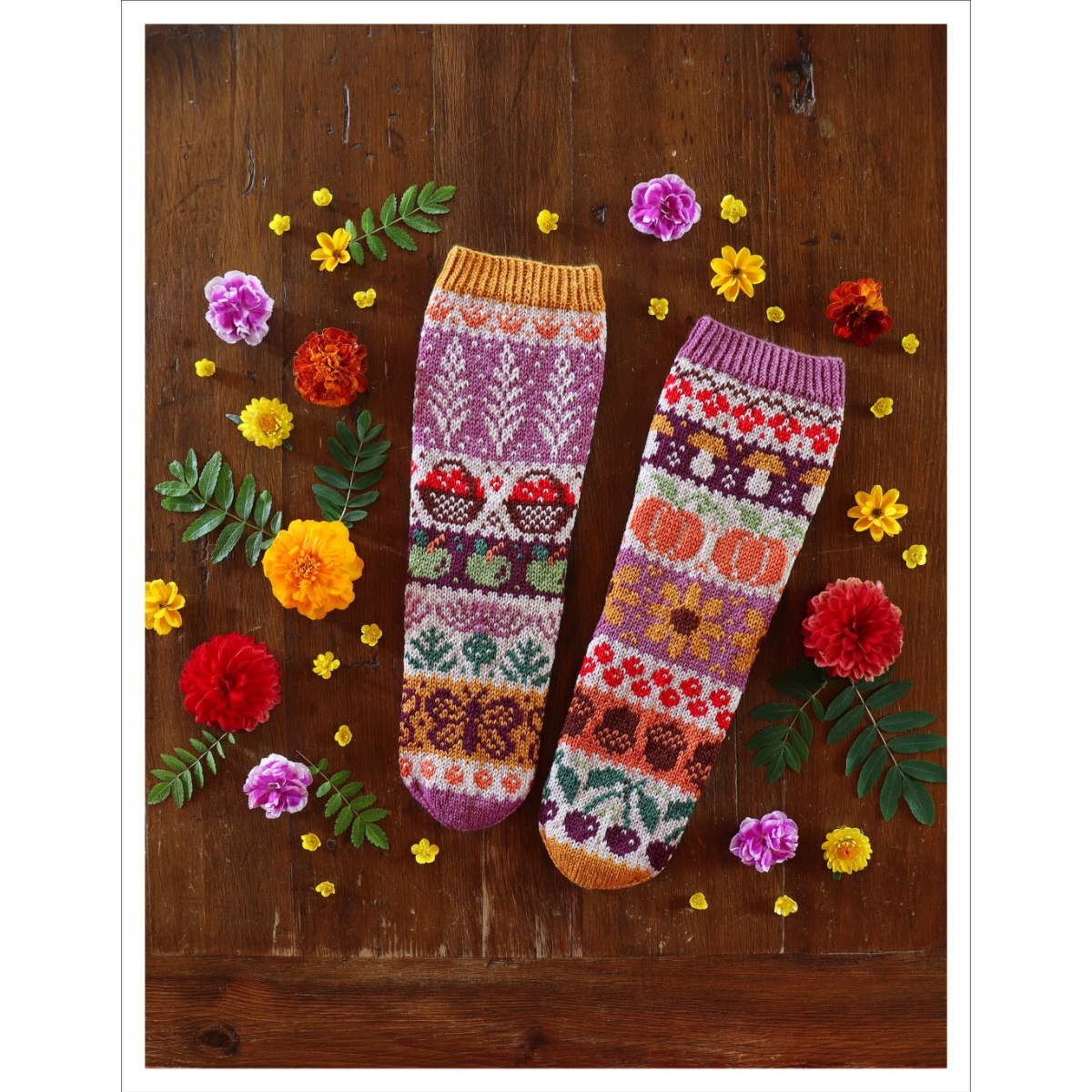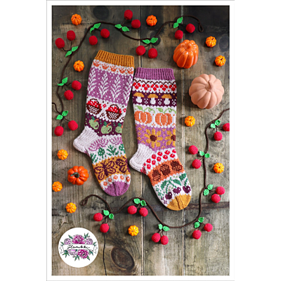 Mabon-sukkien 10-sivuinen PDF-ohjelehtinen sisältää hyvät kaaviokuvat ja sanalliset ohjeet kauniin syksyisiin kirjoneulesukkiin: