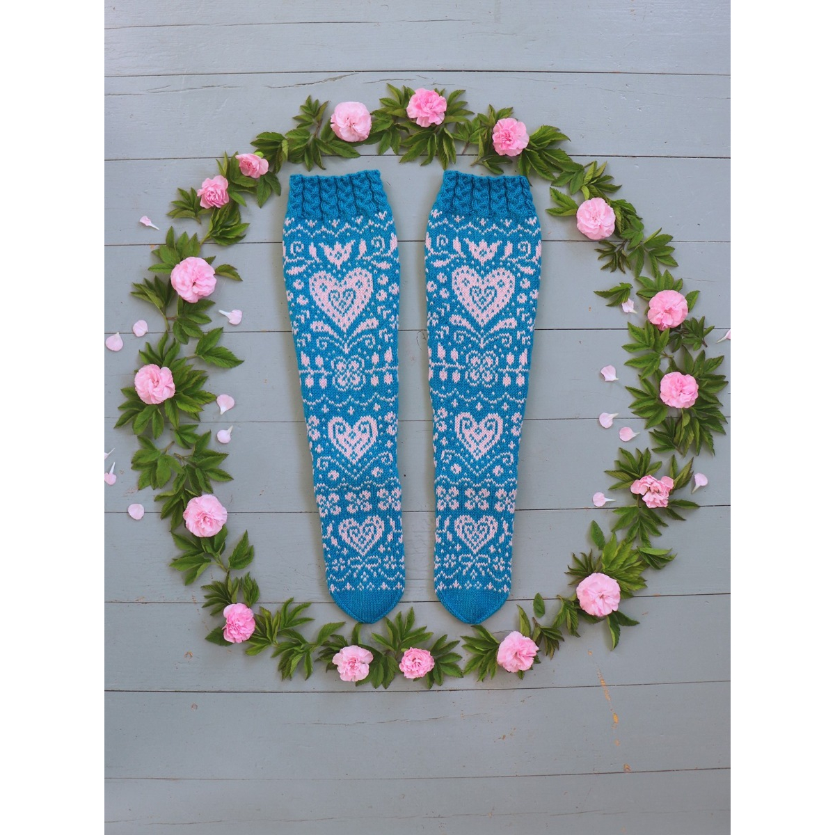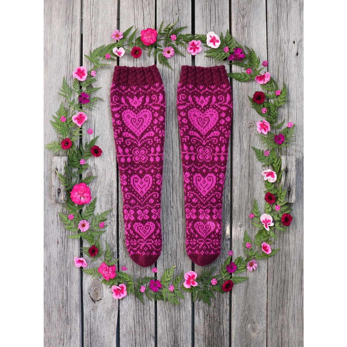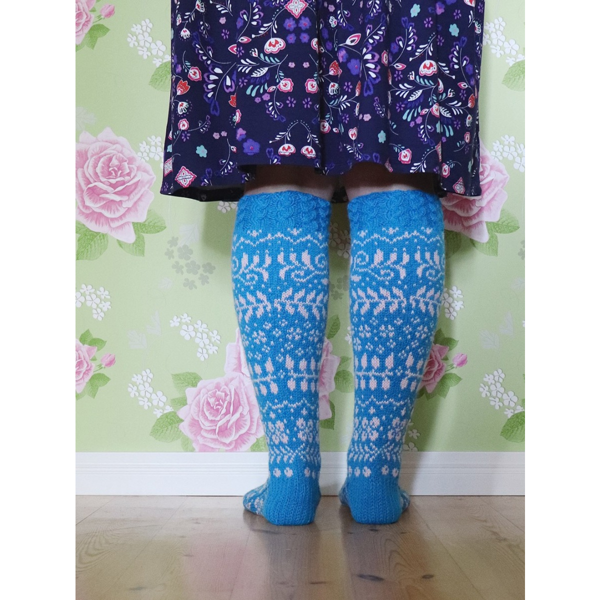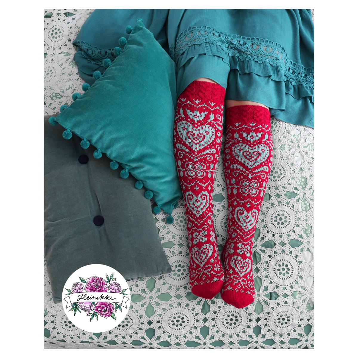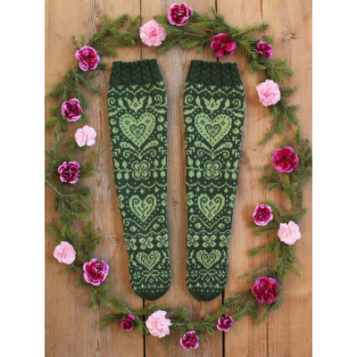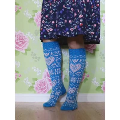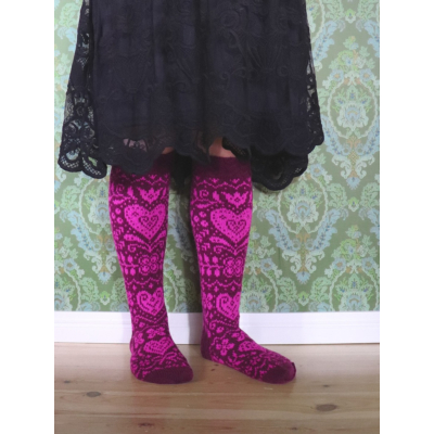 Onneli-sukkien 16-sivuinen PDF-ohje sisältää hyvät kaaviokuvat ja sanalliset ohjeet kauniisiin kirjoneulesukkiin kahdessa eri koossa: