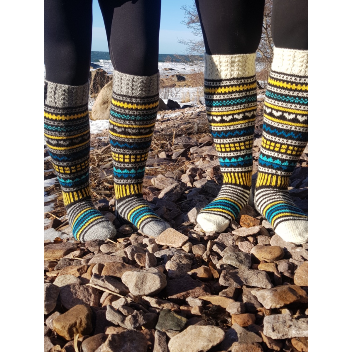 Suuri Käsityö -lehteen 2/2021 alun perin suunnitellut Toivonsäteet ovat täynnä toivoa tulevaisuudesta. Kirjoneulepolvisukat kahdessa varren leveydessä, normaali ja kurvikas.
