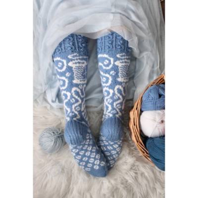 Koko: Kaksi kokoa, sukan varren yläosassa 72 (80) s kerroksella (ennen kirjoneuleen alkua 76 (88) s), jalkaterän koko 35/36 (38/39)  pohkeen ympärys 36 (41) cm