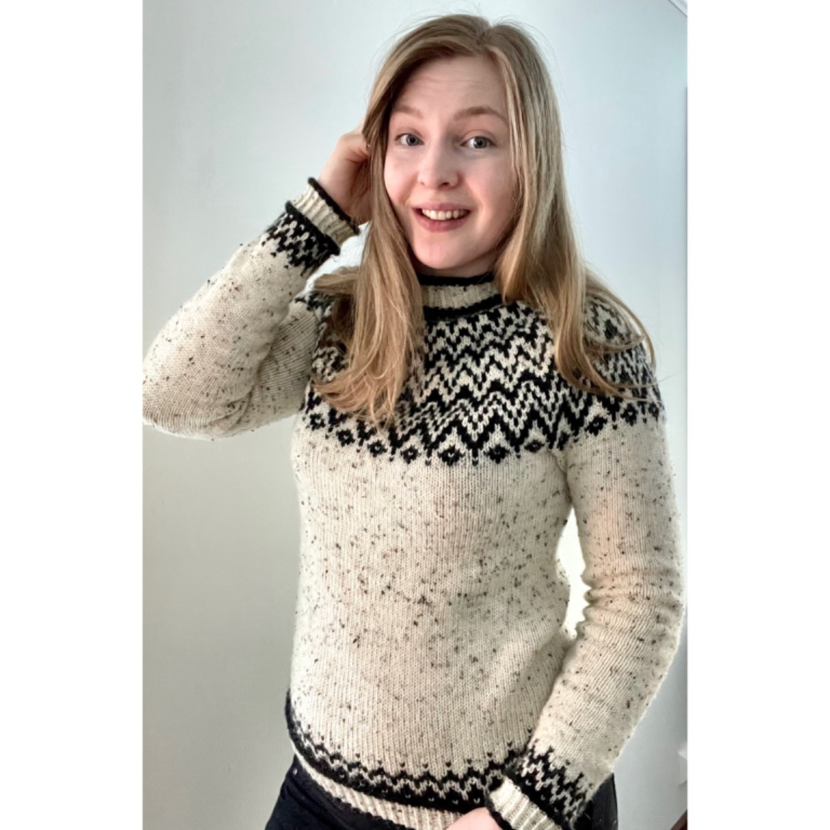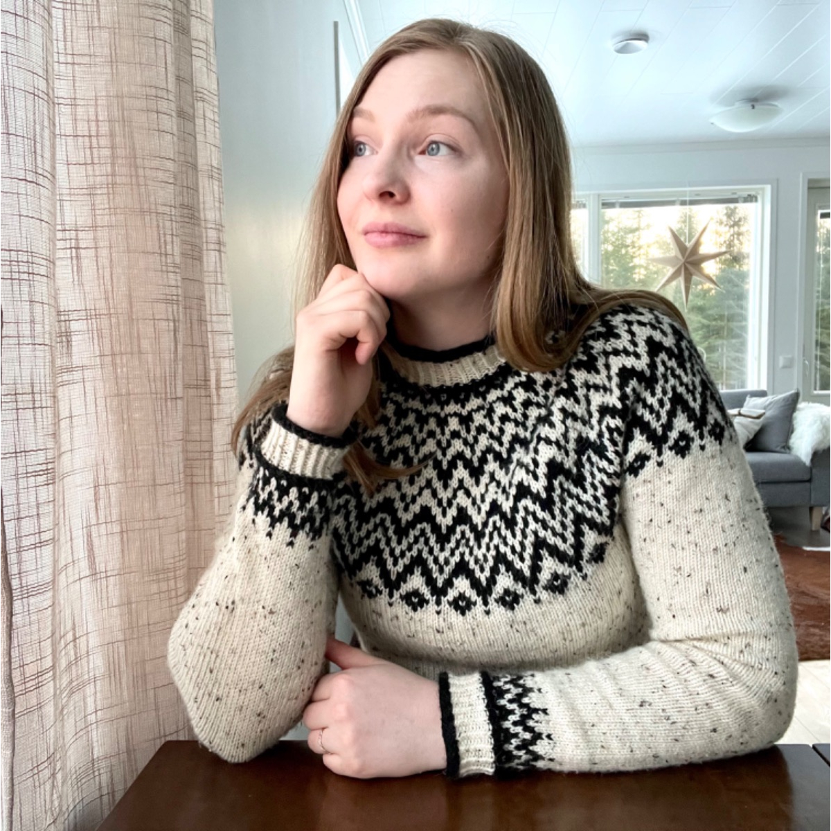 Helppo perinteinen kirjoneule, jossa ei ole pitkiä langanjuoksuja ja maksimissaan kaksi väriä kerrallaan työssä mukana.