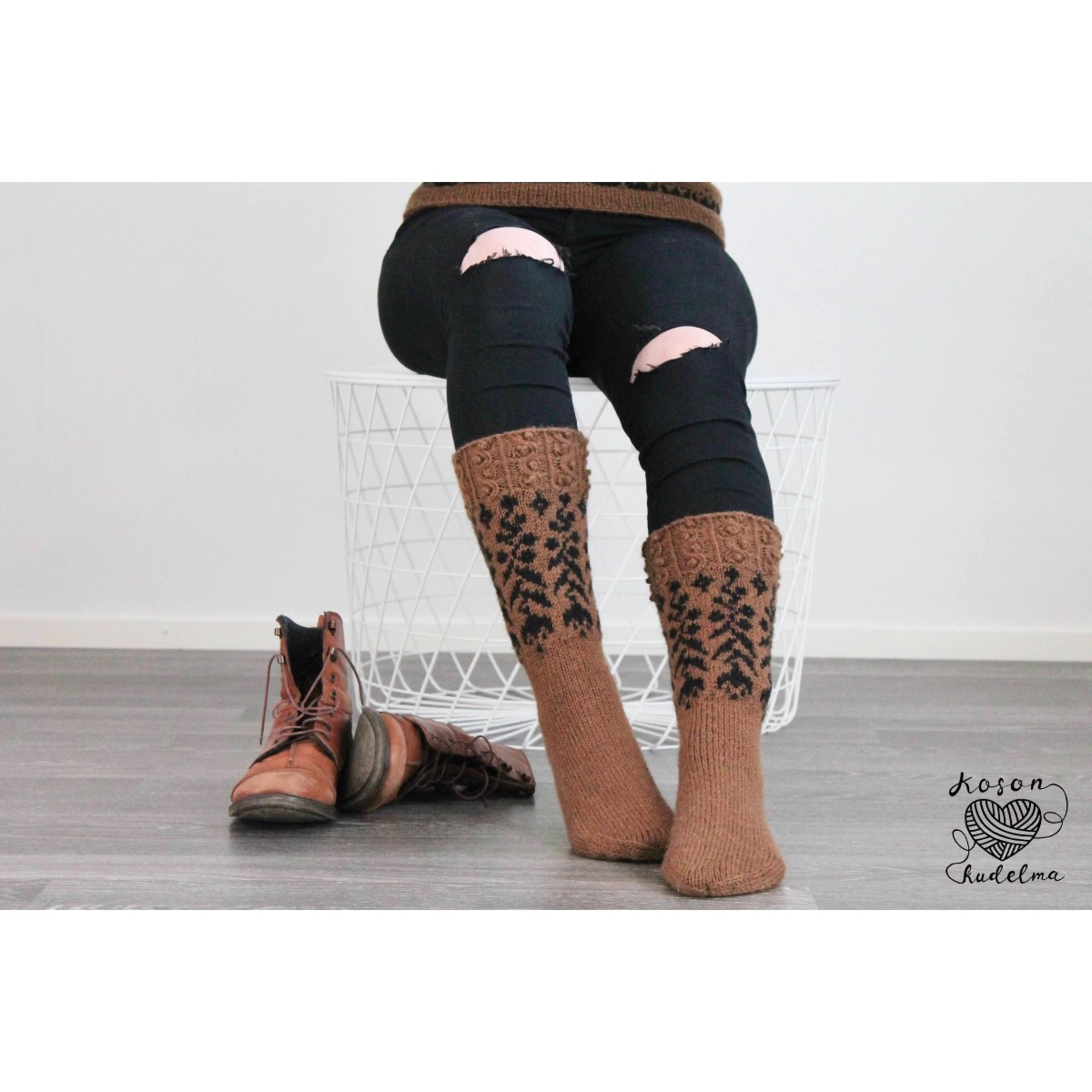 Koko: 38-40, jalkaterän voi tehdä mihin kokoon tahansa, pohje noin 37 cm