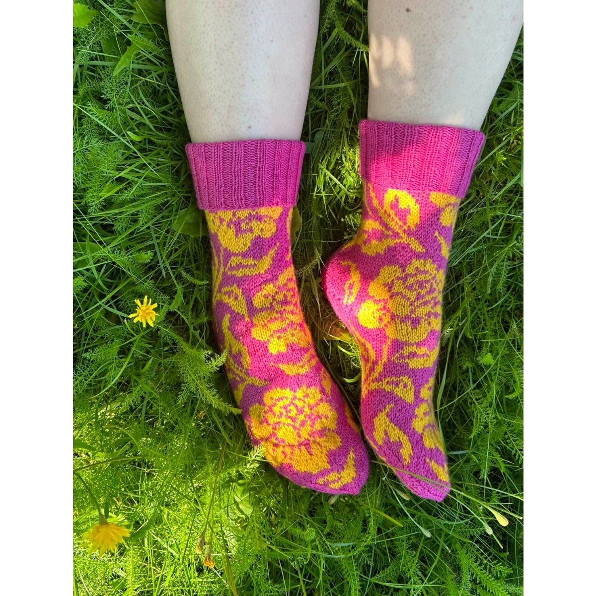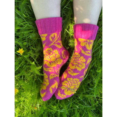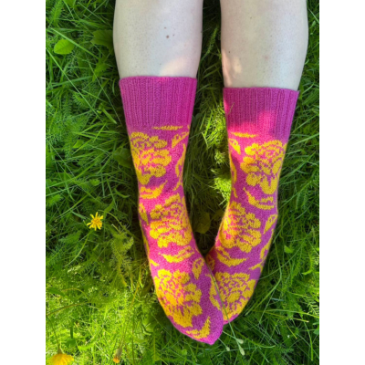 Intiaanikesä-sukkia voit käyttää resori suorana tai käännettynä jos tahdot niihin hieman lyhyemmän varren. Sukat neulotaan kuvan mukaisilla väreillä.