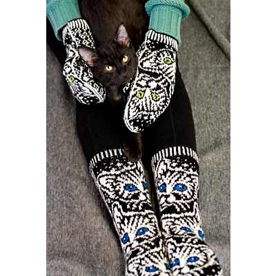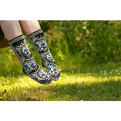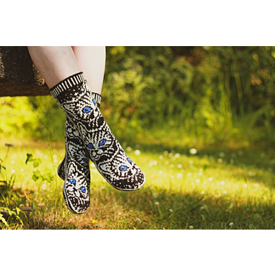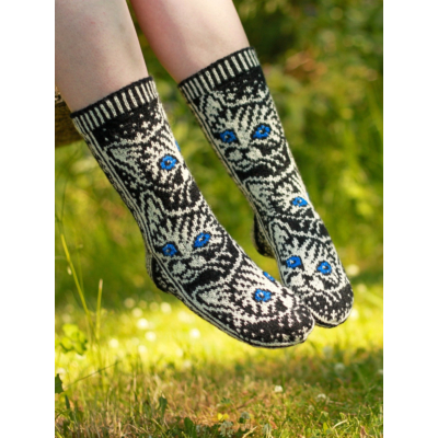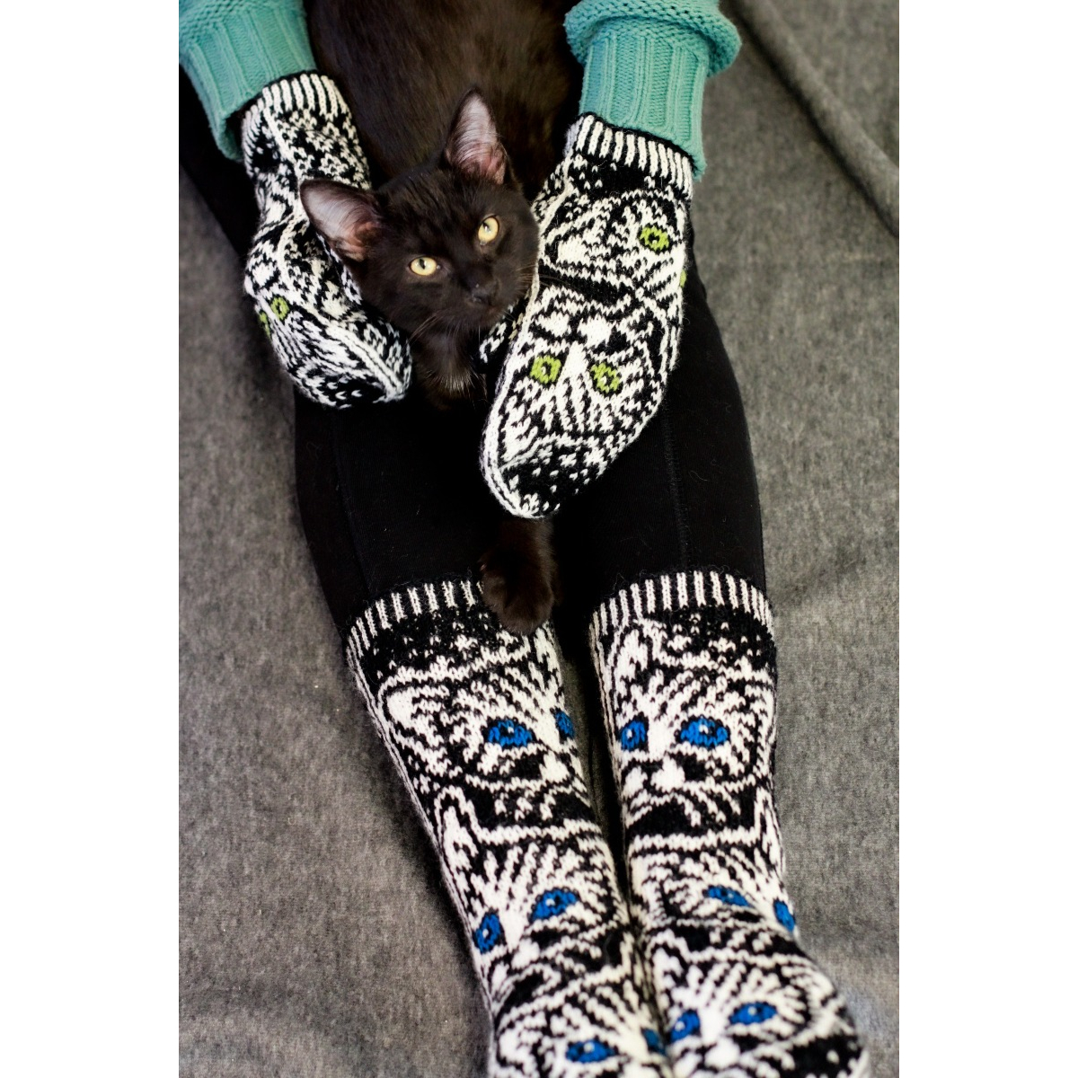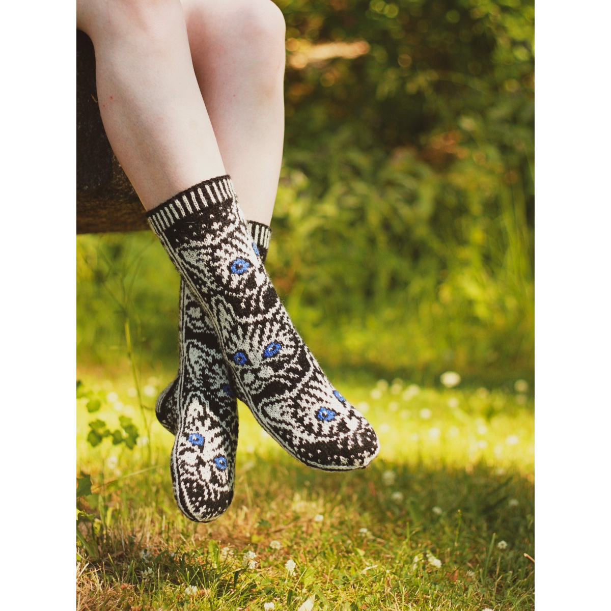 Öiseen aikaan seikkailevat kissat ovat näiden sukkien teema, ja ne ovat samaa sarjaa Yökyöpeli-lapasten kanssa. Huomaa, että tässä tuotteessa kissojen silmät on kirjailtu vihreällä.