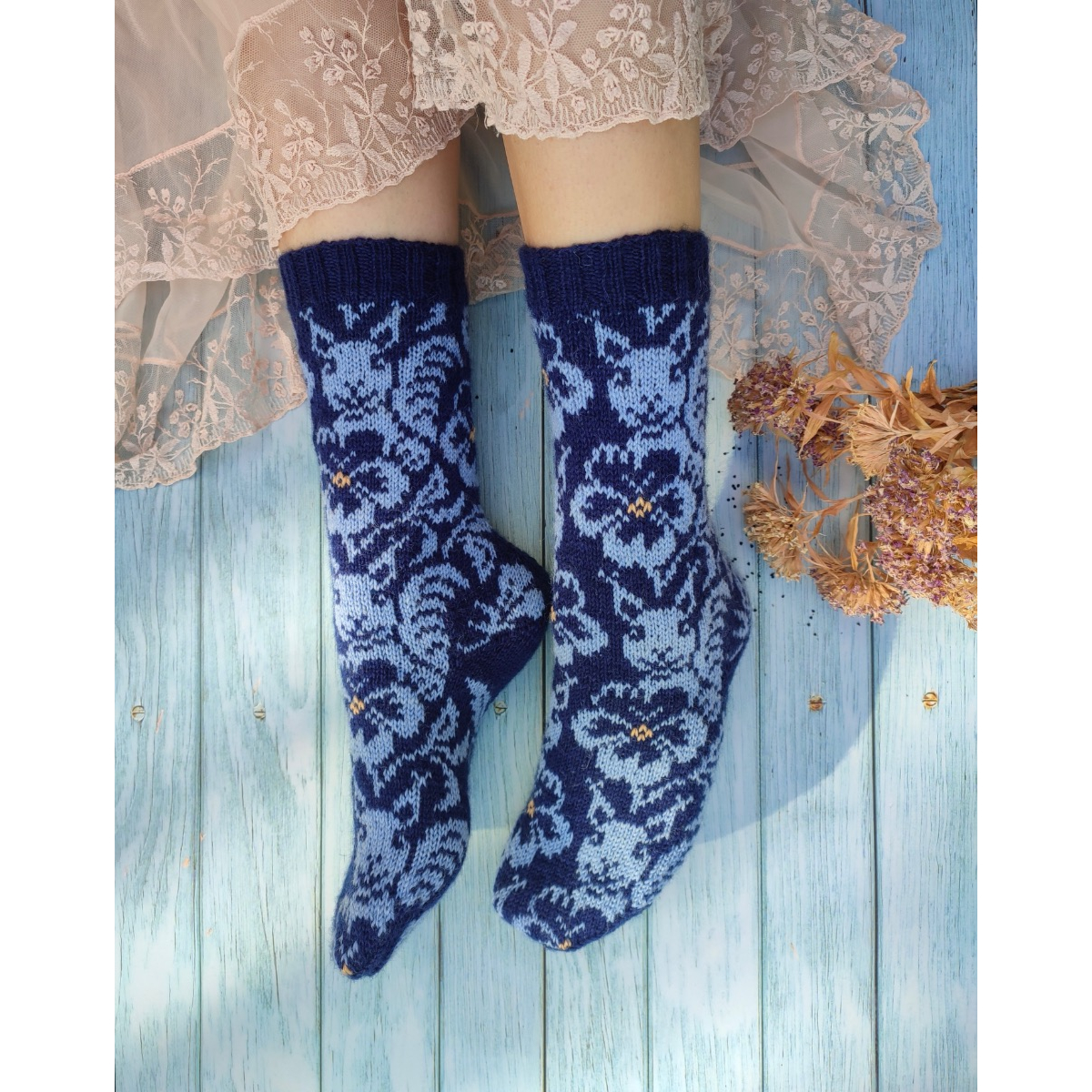 Sukat neulotaan neulotaan kahden värin kirjoneuleena ja orvokkien keltaiset keskiöt lisätään jälkikäteen silmukoita jäljentämällä. Mallissa on pyramidikantapää, jonka kantalappuosio muotoutuu melkein huomaamatta varren neulomisen ohessa. Ainoastaan kantakavennukset tehdään tasona. Koossa 38 kirjoneule jatkuu kärkeen saakka. Ohjeessa neuvotaan myös, miten voit neuloa sukkiin yksivärisen kärjen, mikäli haluat säätää terän pituutta sopimaan omaan käsialaasi tai eri kokoihin.