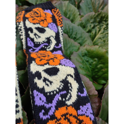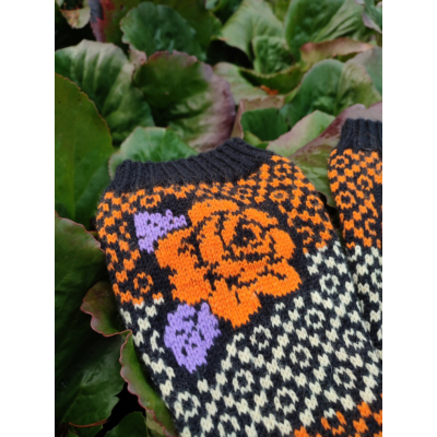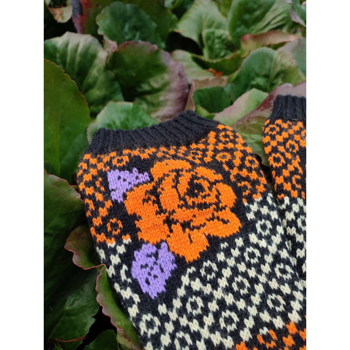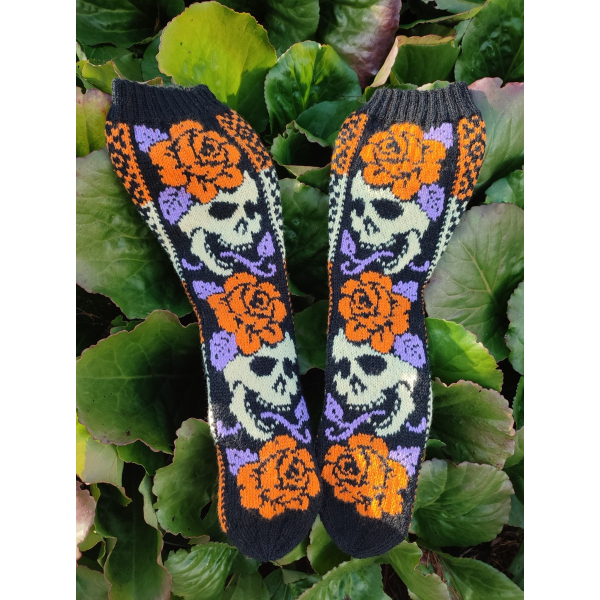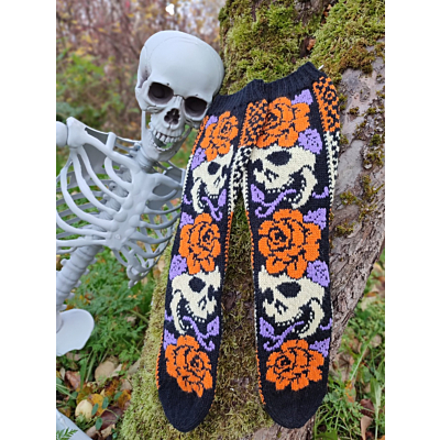 The Still Laughing socks are knitted on five double-pointed needles from the cuff down. The pattern incorporates a reinforced French heel and a round toe. You can choose from two different widths for the calf or knit a mid-calf version with no shaping. The socks are knitted in stranded knitting with two colors per row and the extra colors are worked in duplicate stitch at the end. If you wish to take the easy way, you can knit the socks with just two colors and forget about the duplicate stitching.