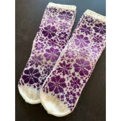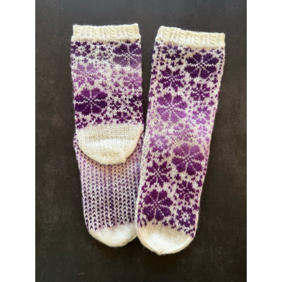 Lapin kesä -sukissa on lyhyehkö varsi ja niitä koristavat liukuvärjätystä langasta neulotut kauniit kukkaset. Värit asettuvat jokaisessa sukassa hieman eri tavalla, joten täysin identtisiä sukat eivät ole.
