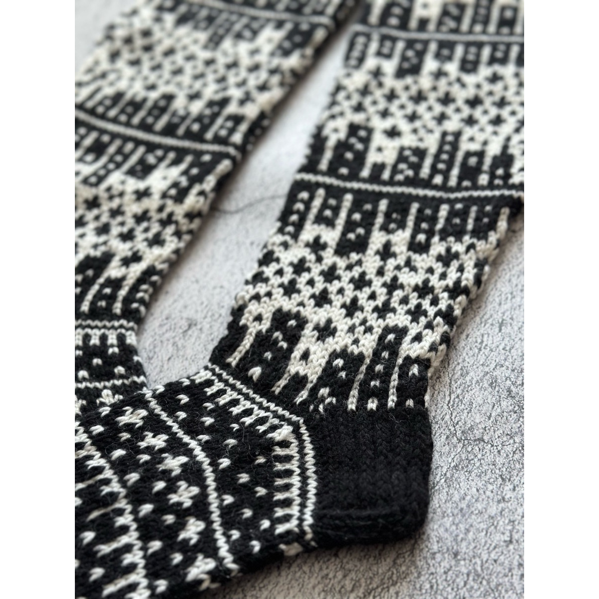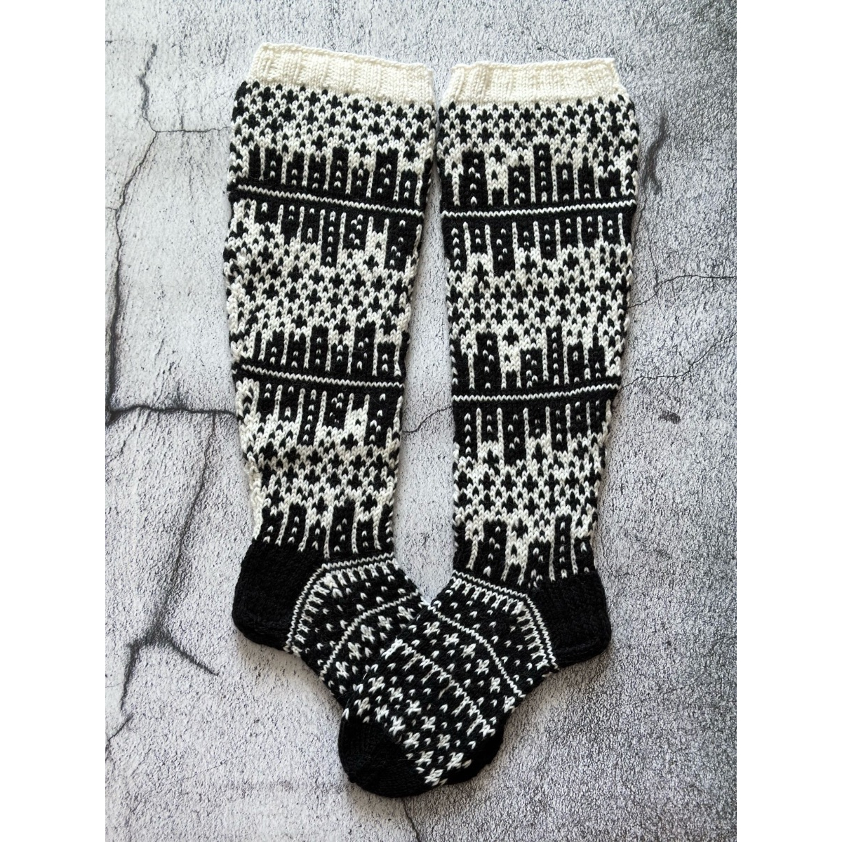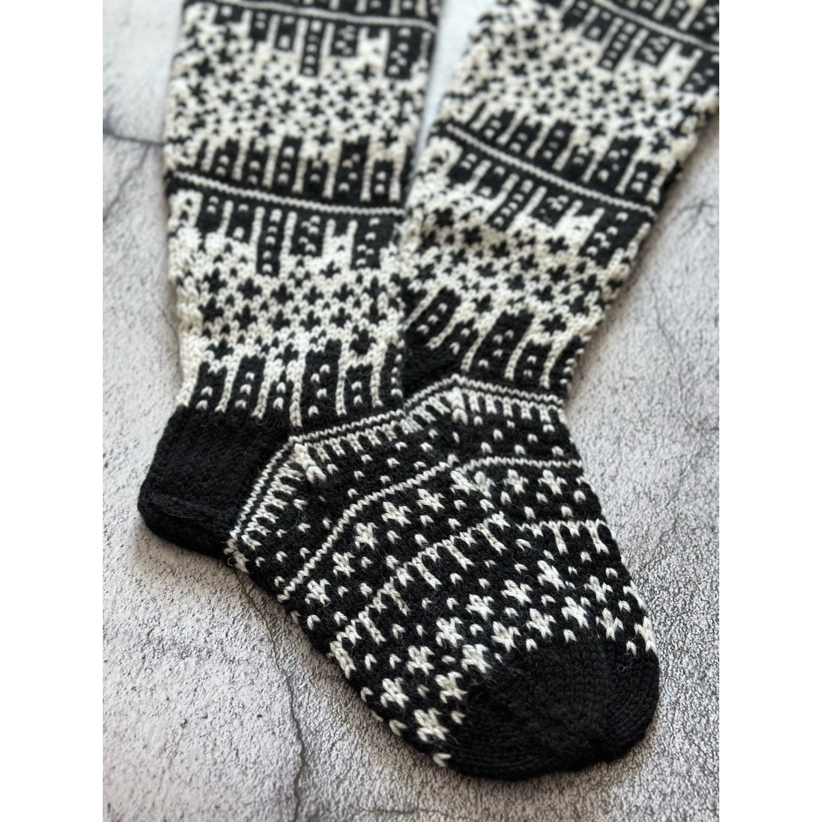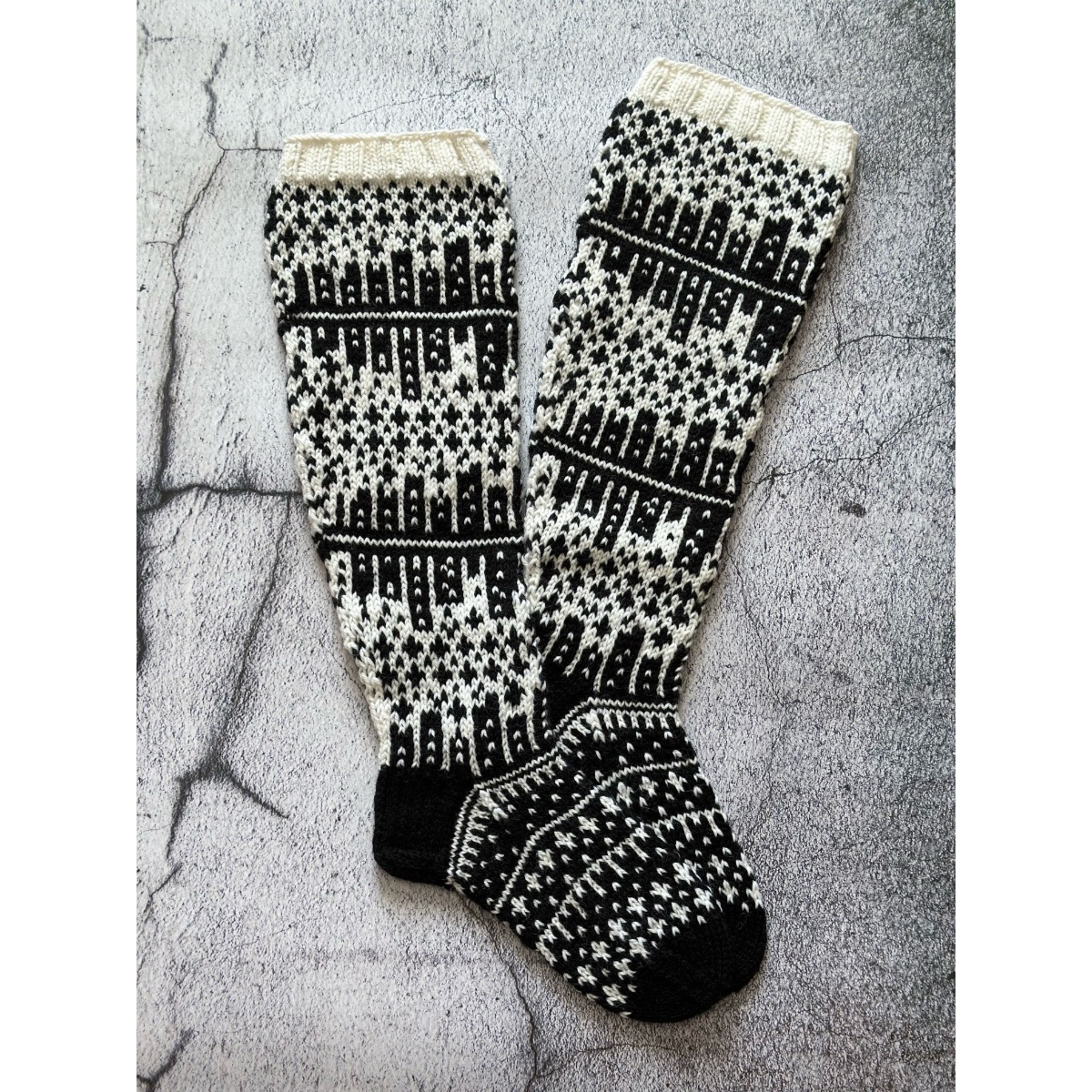 Näitä sukkia koristaa suurkaupungin siluetti vasten kirkasta tähtitaivasta. Sukat neulotaan normaalipaksuisesta sukkalangasta kuvan mukaisissa väreissä eli mustavalkoisena. Voit valita itsellesi sopivan pohkeen ympäryksen ja tietenkin oikean jalan koon.