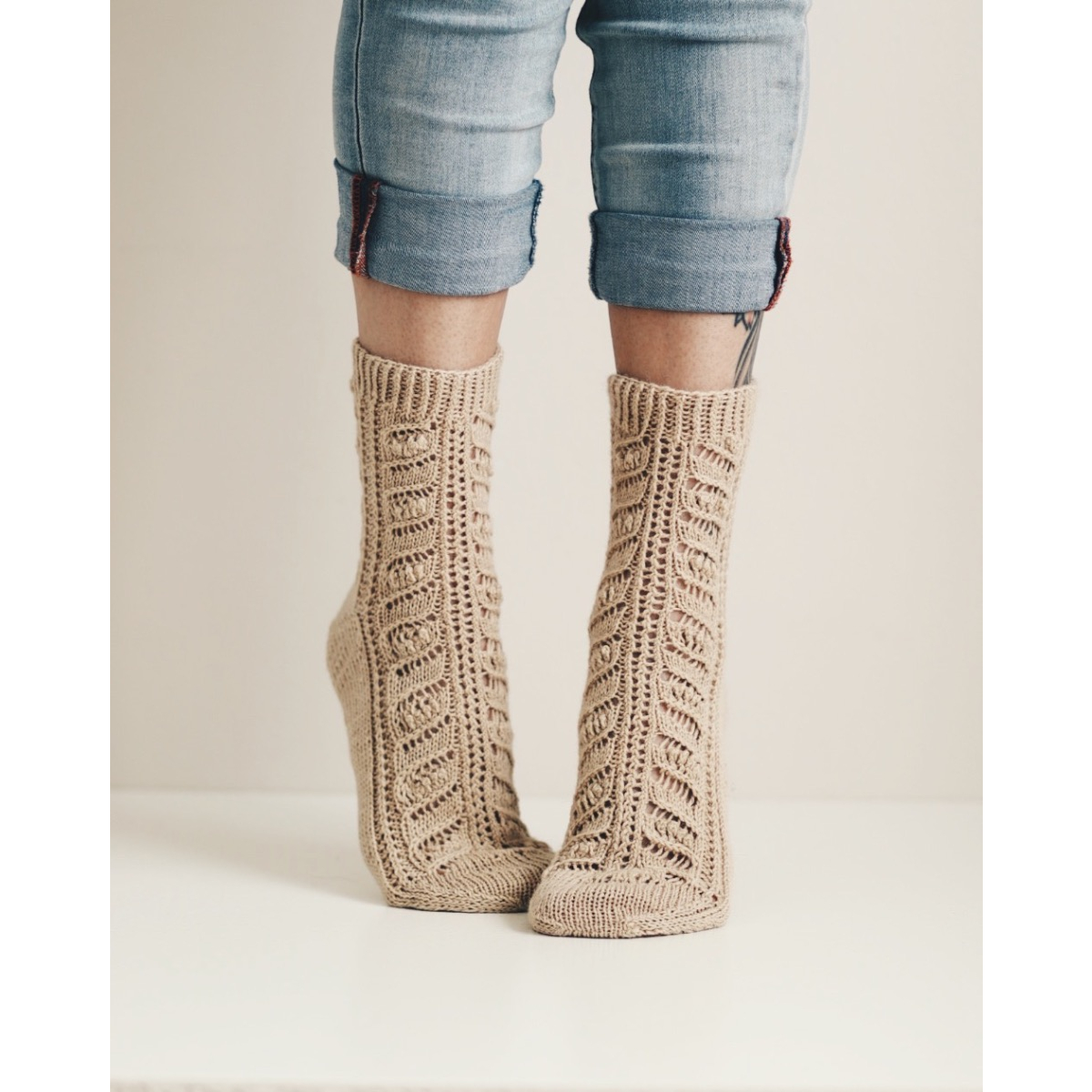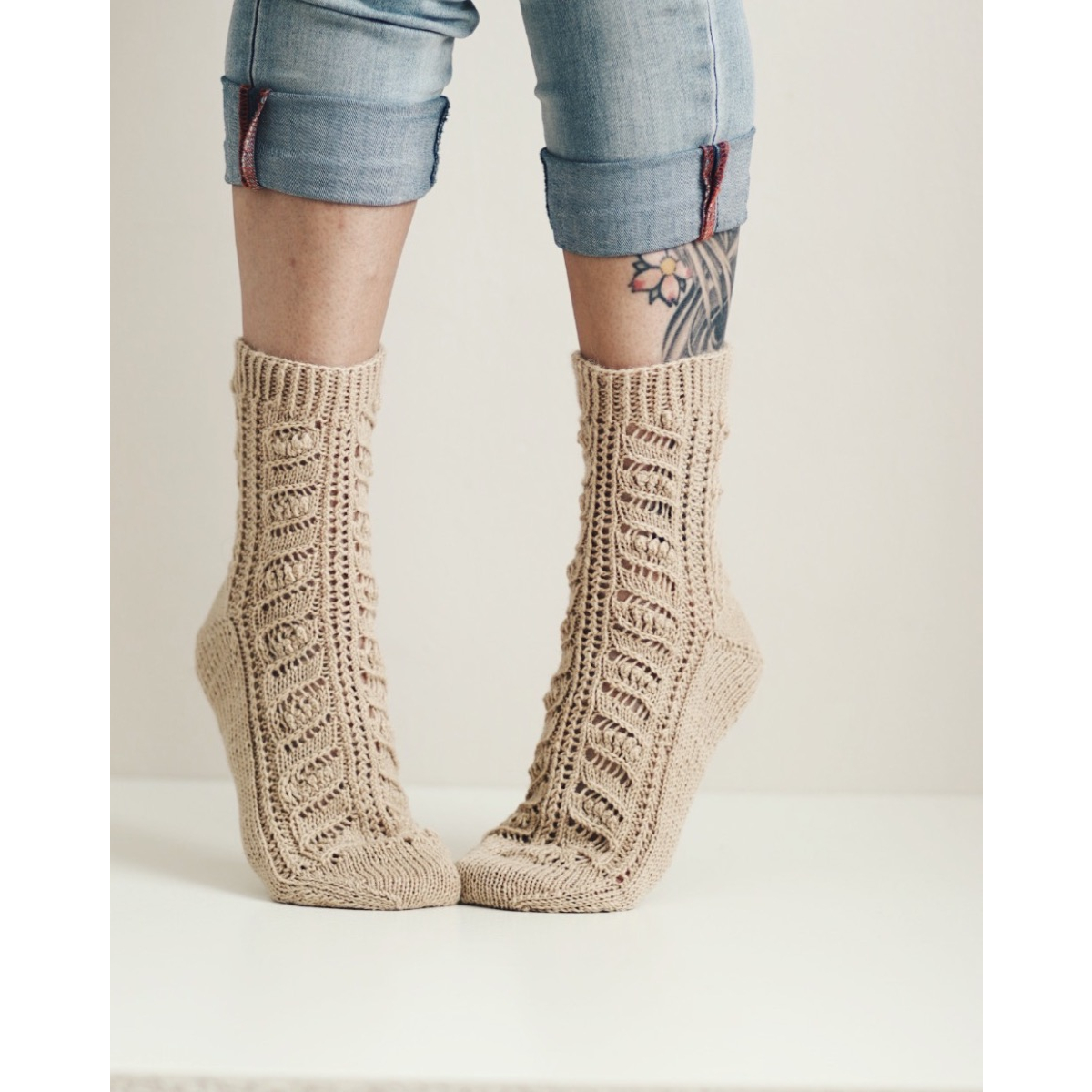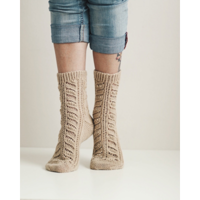 Pihla-sukkien lehdet toistuu varressa, sekä jalkapöydän päällä. Sukat neulotaan varresta varpaisiin.