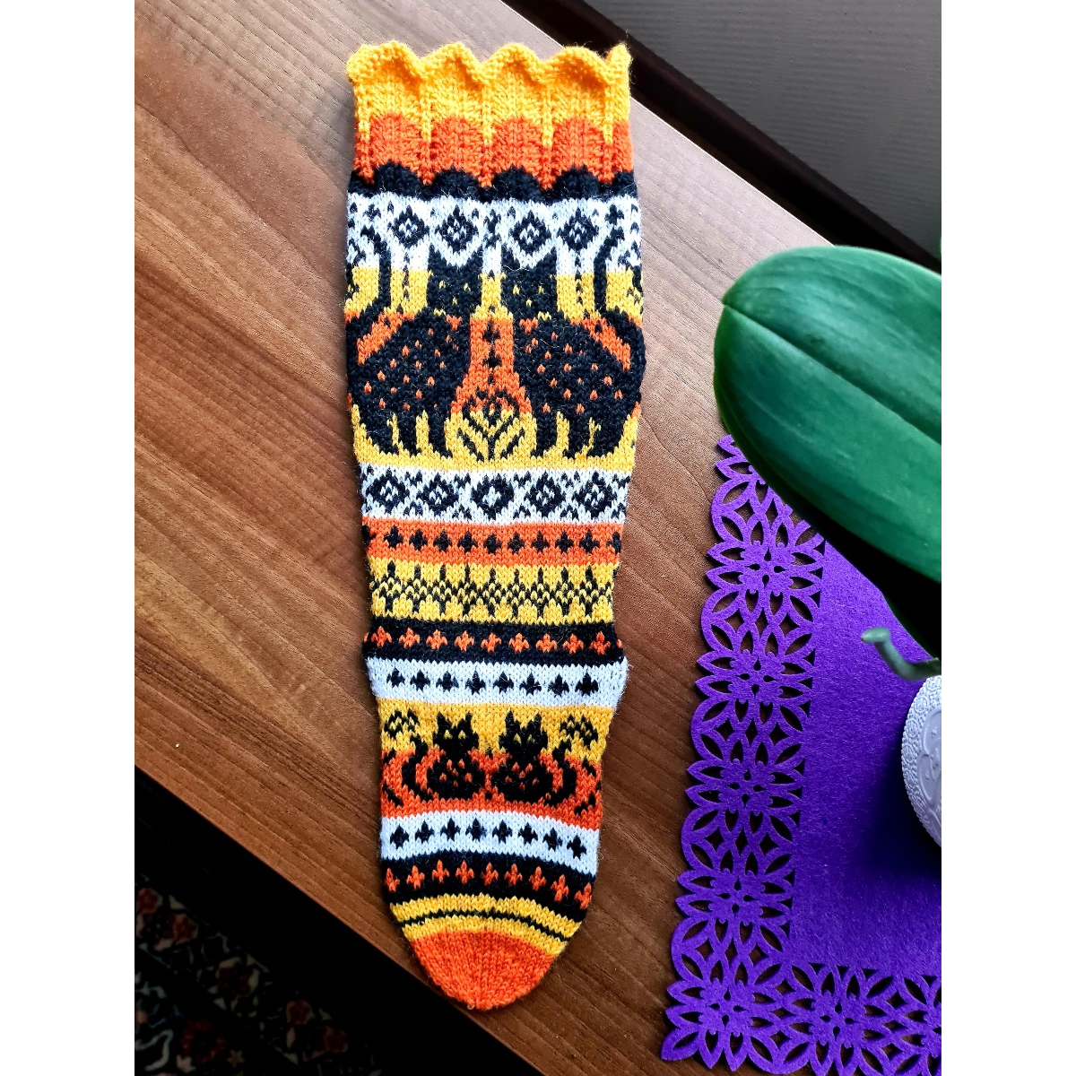 Kirjoneulesukat, joissa seikkailee mustia kissoja aurinkoisen pirteällä taustalla. Normaalipohkeen ohje samasta mallista löytyy SiniSukat-kirjasta.
